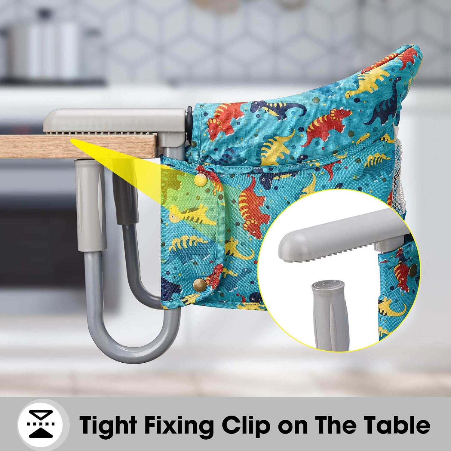 - EASY TO INSTALL: This portable high chair attaches quickly and easily to tabletops. It is compatible with most tabletops and fits tables from 0.8” to 3.4” (20-85mm) thick. Operating this hook on chair is quick and simple