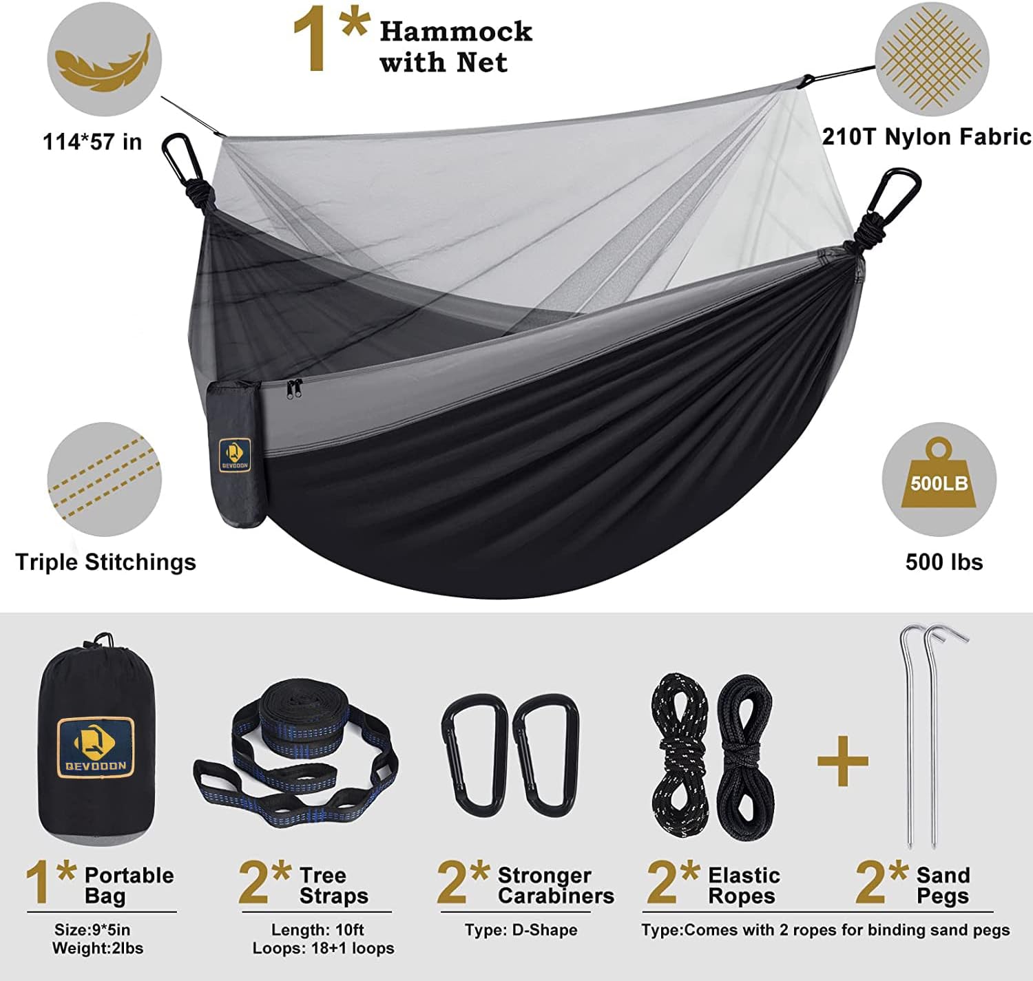 - 【BREATHABLE & PREMIUM NET】: Do you hate being bitten by mosquito while camping? High density nets can effectively protect you from those creepy crawlers. Breathable and ventilated mesh allows you to safely enjoy your camping time. Net and hammock are connected by 2 quality zippers.If you want to know more details about using hammock, please move down on this page to find Product guides and documents, check Safety Information (PDF), you will get more instruction help