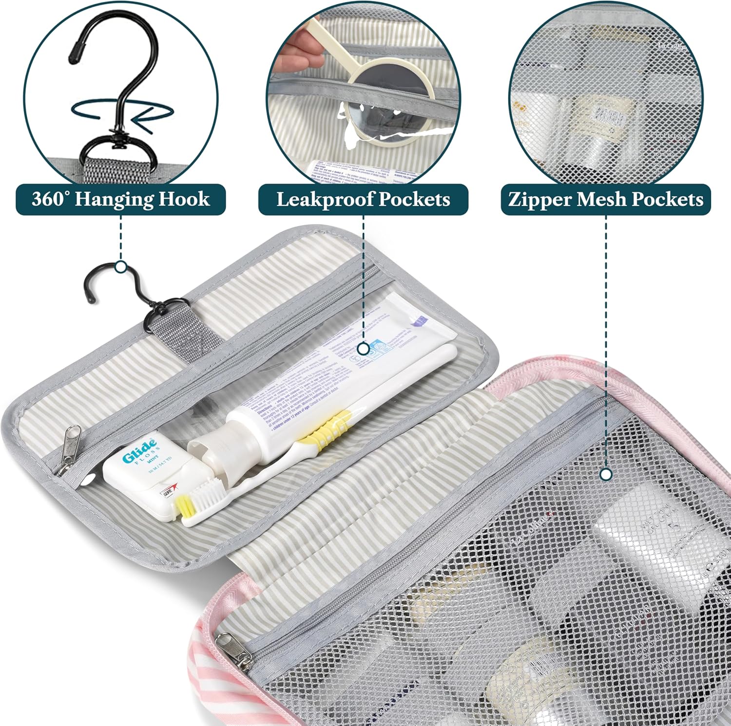 - HANGING COSMETICS TRAVEL BAG ORGANIZER: This toiletry bag for women has a hanging hook and multiple pockets that help you stay organizer during business trip, vacation travel. The hanging hook makes it easy to hang the toiletry bag to bars in the hotel shower bathroom. Unzip your toiletry bag to reveal compartments to organize your shampoo, skincare face hygiene products. This toiletry travel bag is an essential accessory for cruise in Europe, plane, Hawaii Trip, and honeymoon.