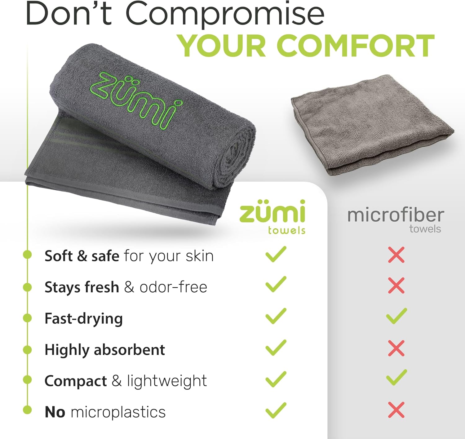 Zumi 100% Cotton Quick Dry Large Travel Towel - Soft, Thin, Compact, Highly Absorbent, Lightweight Camping Towel for Beach, Gym, Bath, Shower, Swimming, Dorm, RV - Gray