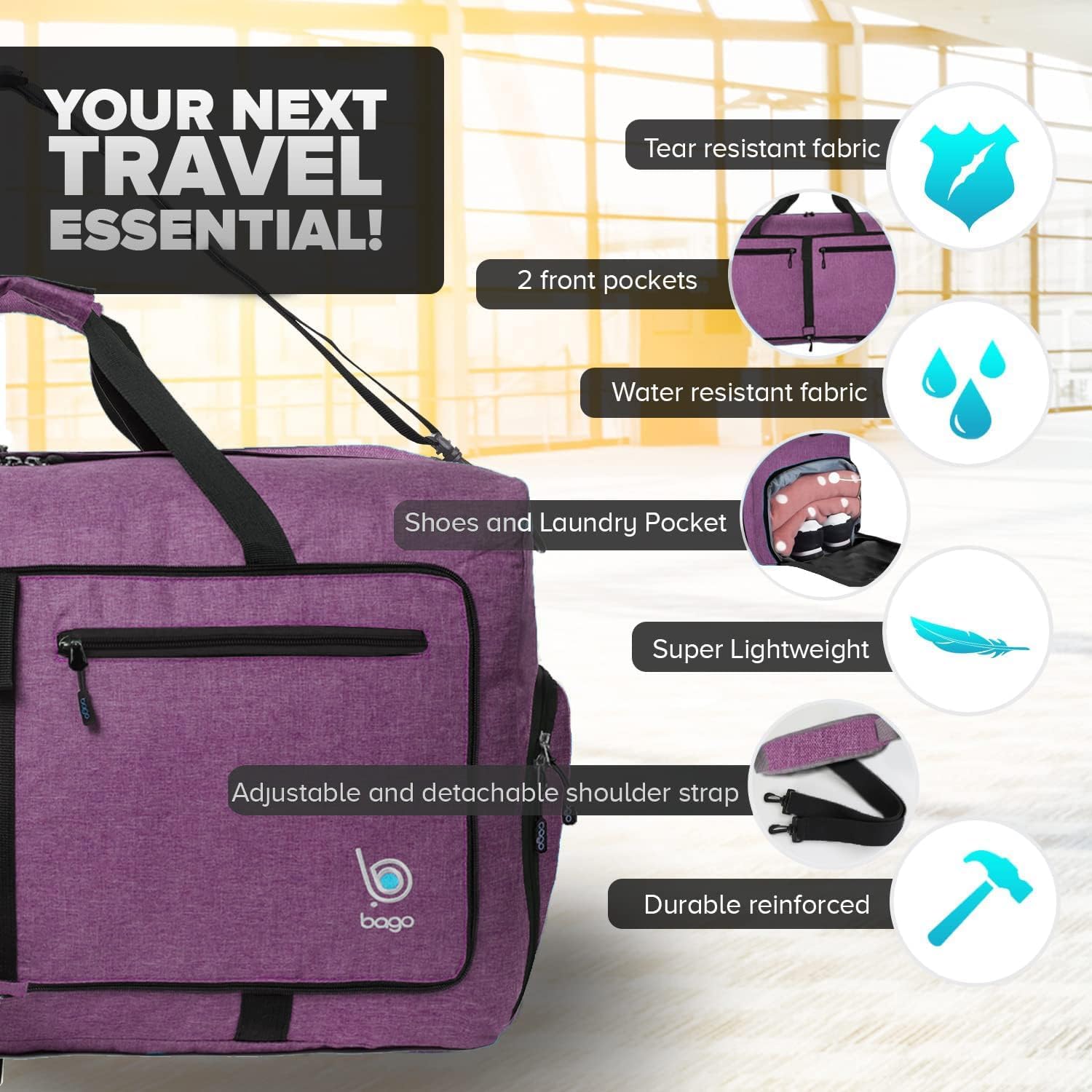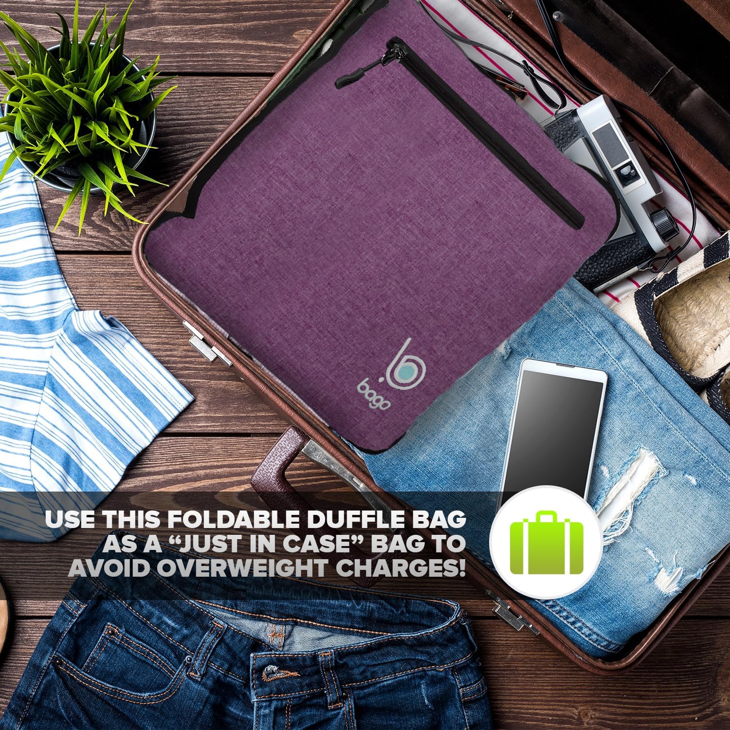 Bago Foldable Duffel Bags for Traveling Women & Men - 60L Medium Packable Duffle Bag for Travel with Shoe Compartment - Water Repellant, Heavy Duty, Lightweight Folding & Collapsible (SnowDepPurple)