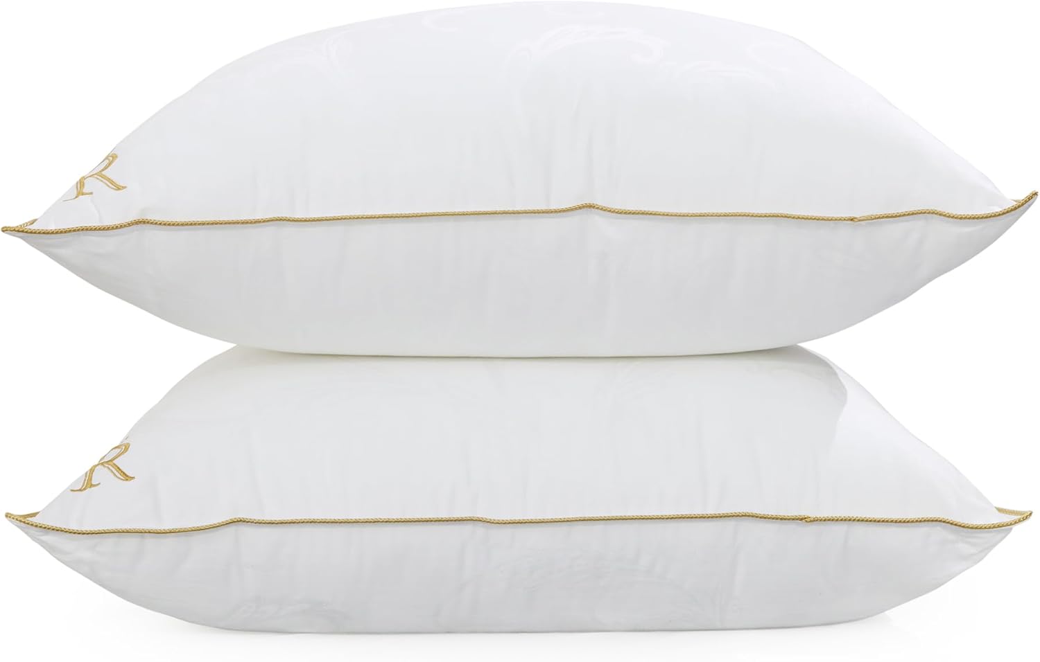 - Down Alternative Hotel Pillows for Bed: Enjoy the luxury of a 5-star hotel with these standard pillows set of 2, an emblem of sophistication with their embroidered logo and gold piping around the edges. Made with the finest handmade filling material, these pillows for bed are fully adjustable to fit your comfort.