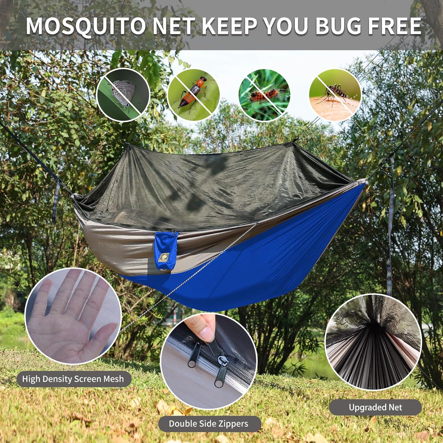Camping Hammock with Net,Travel Portable Lightweight Hammocks with Tree Straps and Solid D-Shape Carabiners,Parachute Nylon Hammock for Outsides Backpacking Beach Backyard Patio Hiking Blue & Grey
