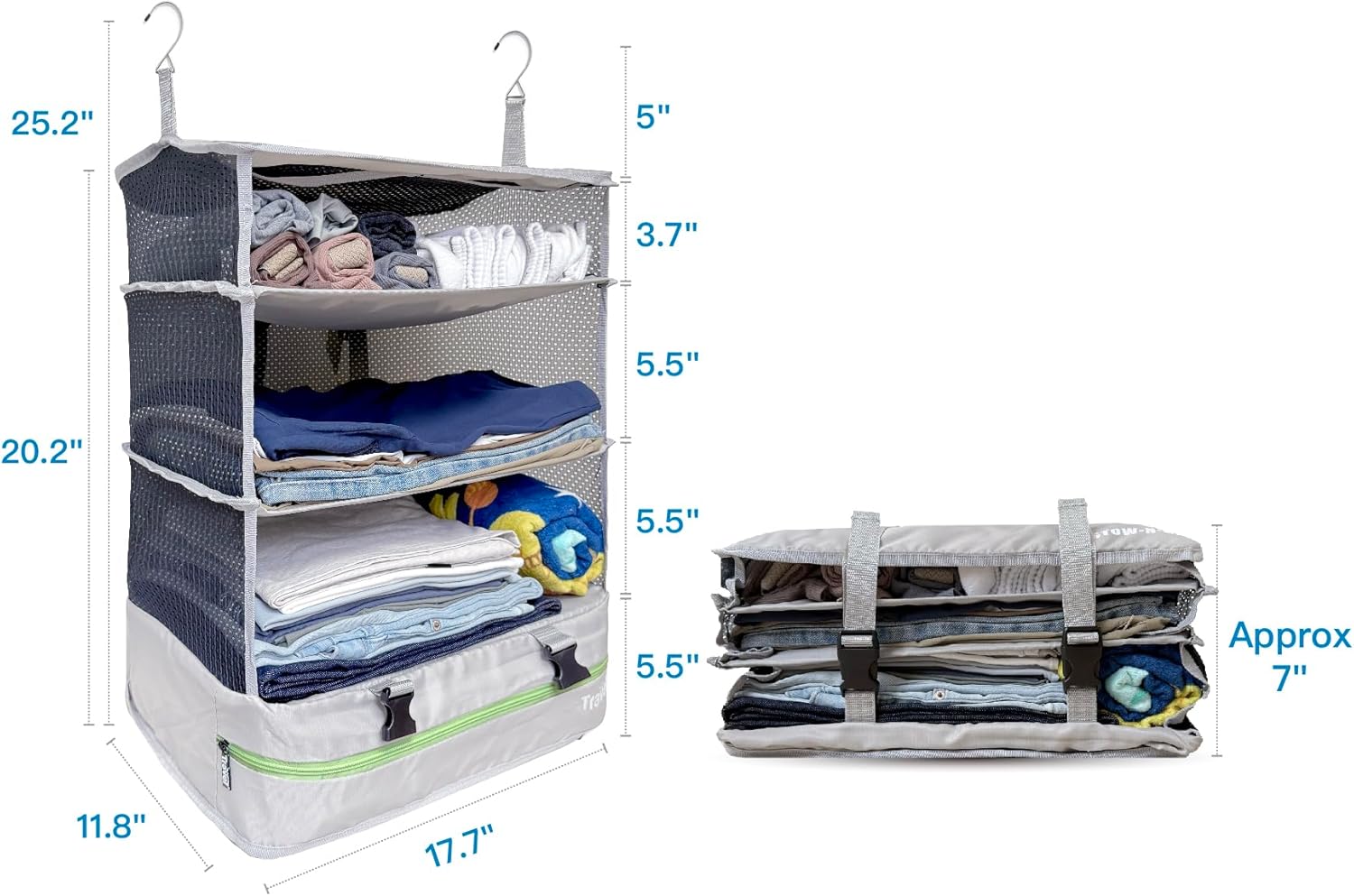 Stow-N-Go Travel Luggage Organizer – Portable Hanging Travel Shelves, Carry-On Closet Organizer, Hanging Packing Cubes, Collapsible Carry-On Organizer for Cruises & Hotels. Light Gray - XL