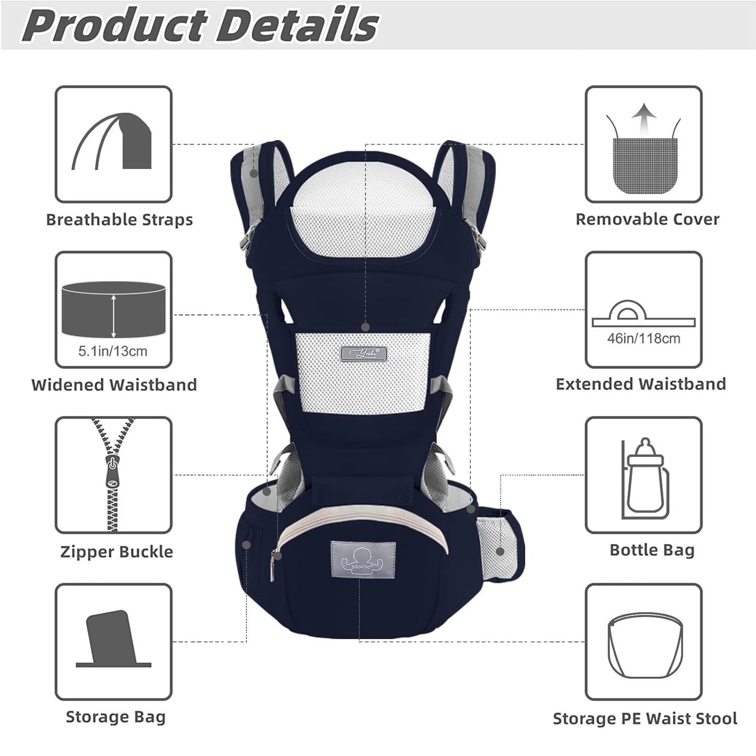 - Ergonomic Hip Seat: The waist stool maintains the baby's M-shape during carrying, helping their skeletal development. The wide waistband make the hip seat to fit snugly against the parent's waist, helping to share the weight during carrying baby. The inward sloping angle of the hip seat keeps the baby close to the parent's body comfortably and reduces bumps and shaking when parents walking. Besides, it make baby feel safety in their arms.