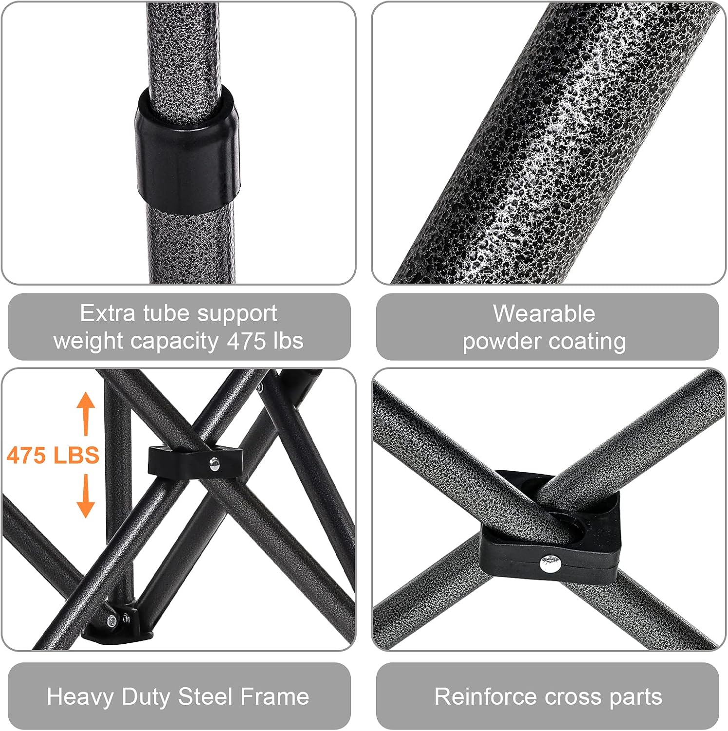 - šŖ HEAVY DUTY STEEL FRAME: This Camp Chair Uses Reinforced Frame With Two Extra Front Support Poles, Weight Capacity 475lbs. Durable Rustproof Coating For Long-term Use.