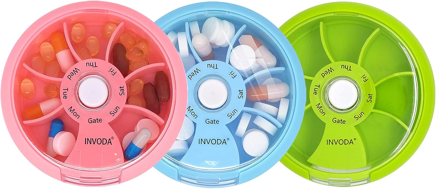 INVODA Weekly Pill Organizer 7 Compartment Rotating Pill Box for Daily Medication & Vitamins - Portable Travel Pill Case Fish Oil Supplements Vitamins Organizer (Pink+Sky Blue+Green)