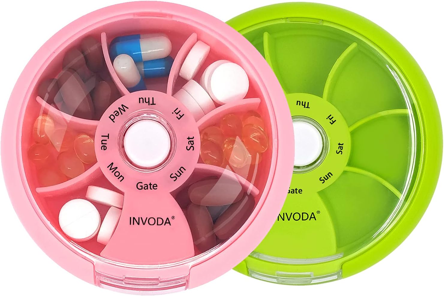 INVODA Weekly Pill Organizer 7 Compartment Rotating Pill Box for Daily Medication & Vitamins - Portable Travel Pill Case Fish Oil Supplements Vitamins Organizer (Pink+Green)