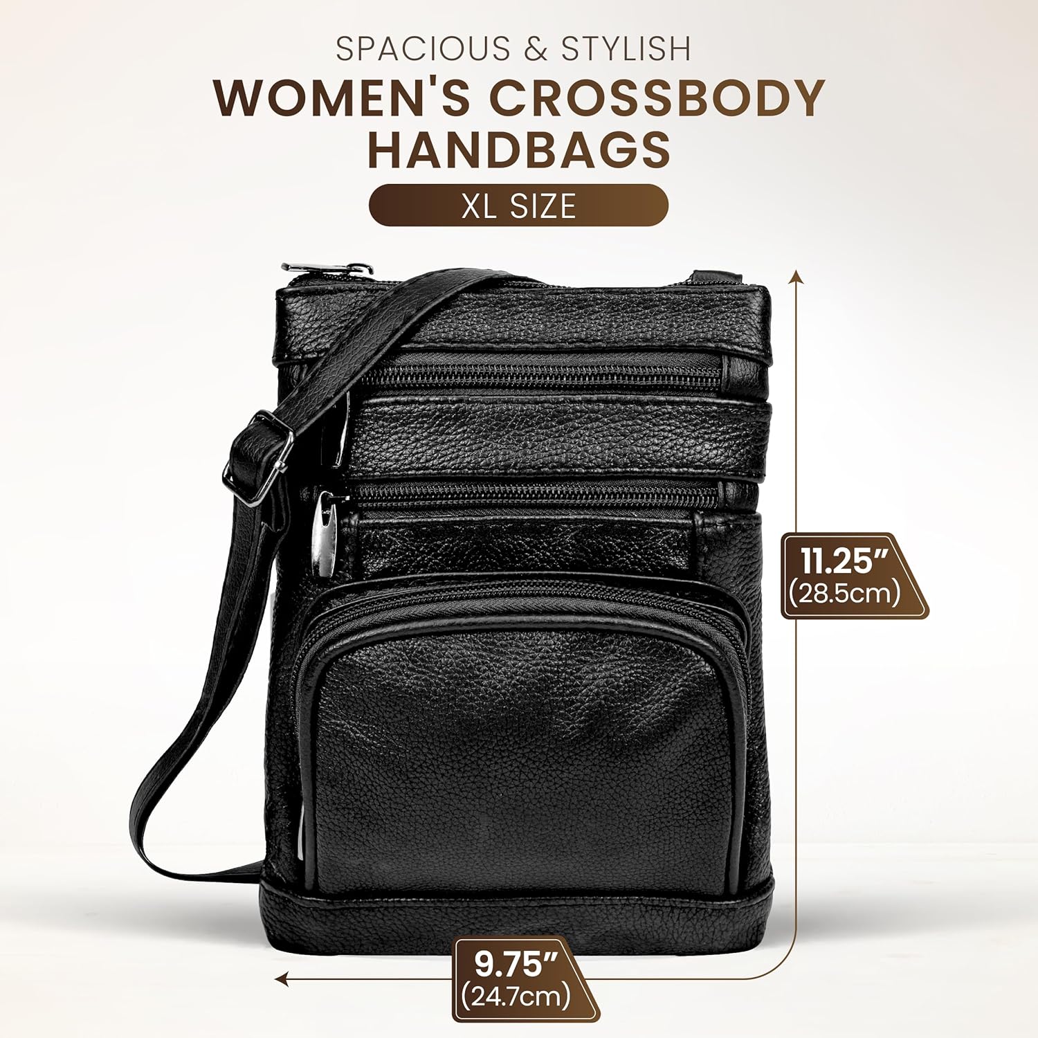 - Crossbody Purse With Unique Design - Our womens crossbody purse features 5 exterior zip pockets, including a top zippered main pocket, three front zippered pockets, one rear pocket, and a shoulder leather strap. These regular size crossbody purses for women have dimensions: 11.25" (height) x 9.75" (width).