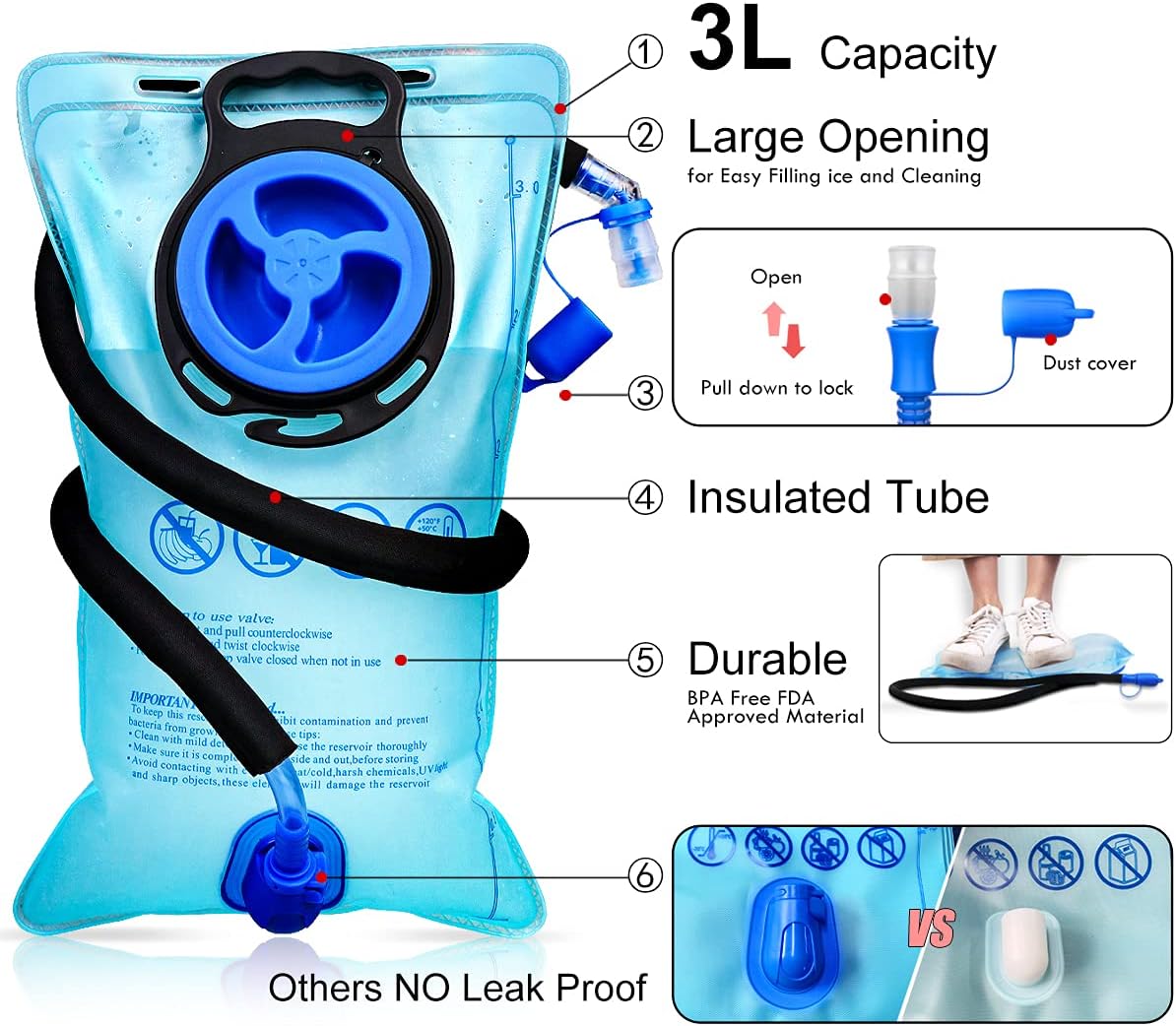 - 🔎 【UPGRADE LEAK PROOF DESIGN OF BLADDER】- The opening is large design, Removable insulated drinking tube with click in connection instead of traditional screw one, it will never get loose and causing leakage, and just bottom up, it will easily quick dry by itself. Every Mothybot water-resistant nylon backpack comes with adjustable straps, heavy duty and hidden-teeth zippers, safety reflectors on the shoulder straps and front of the pack, it is super durable and reliable for daily use.
