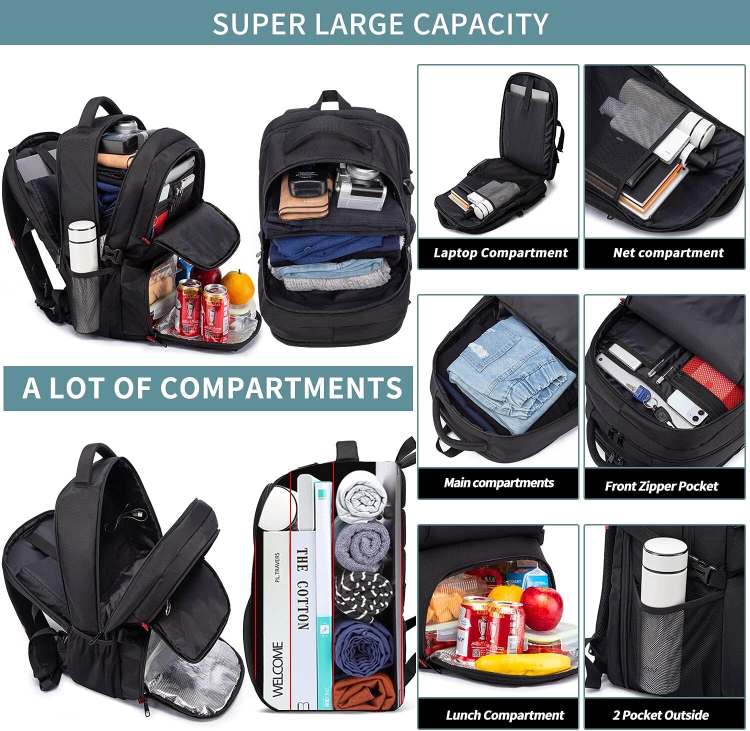 - TONS OF STORAGE & POCKETS- Large backpack for men own 1 separate thicker padded laptop compartment to hold up 17.3 inch laptop. 3 main compartments with double zippers can accommodate 50 liters of things, such as lunch, clothes, travel accessories and other daily necessities. Both side water bottle pockets outside for holding water bottles or umbrellas. More than 15 functional pockets ensure you to keep your personal belongings well-organized and get them easily.