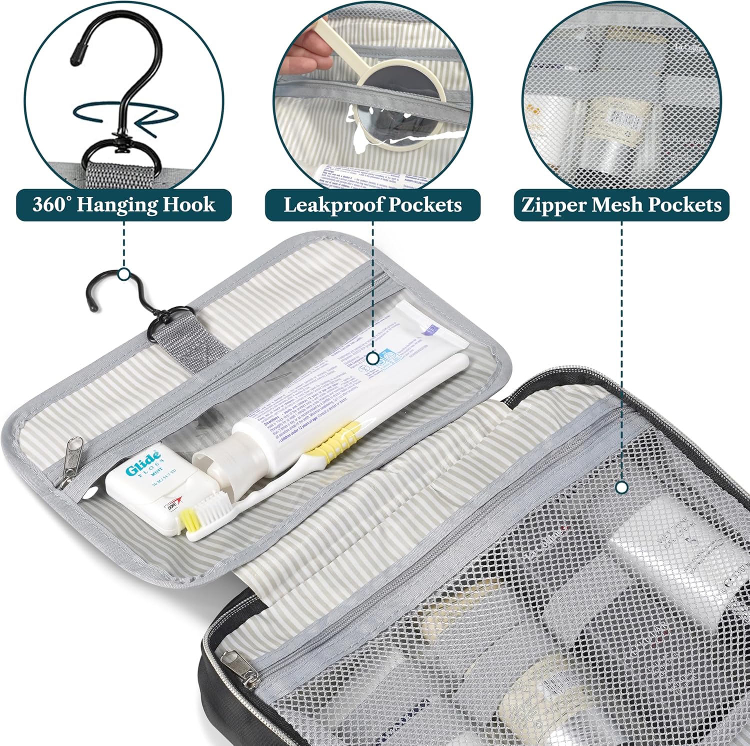 - HANGING COSMETICS TRAVEL BAG ORGANIZER: This toiletry bag for women has a hanging hook and multiple pockets that help you stay organizer during business trip, vacation travel. The hanging hook makes it easy to hang the toiletry bag to bars in the hotel shower bathroom. Unzip your toiletry bag to reveal compartments to organize your shampoo, skincare face hygiene products. This toiletry travel bag is an essential accessory for cruise in Europe, plane, Hawaii Trip, and honeymoon.