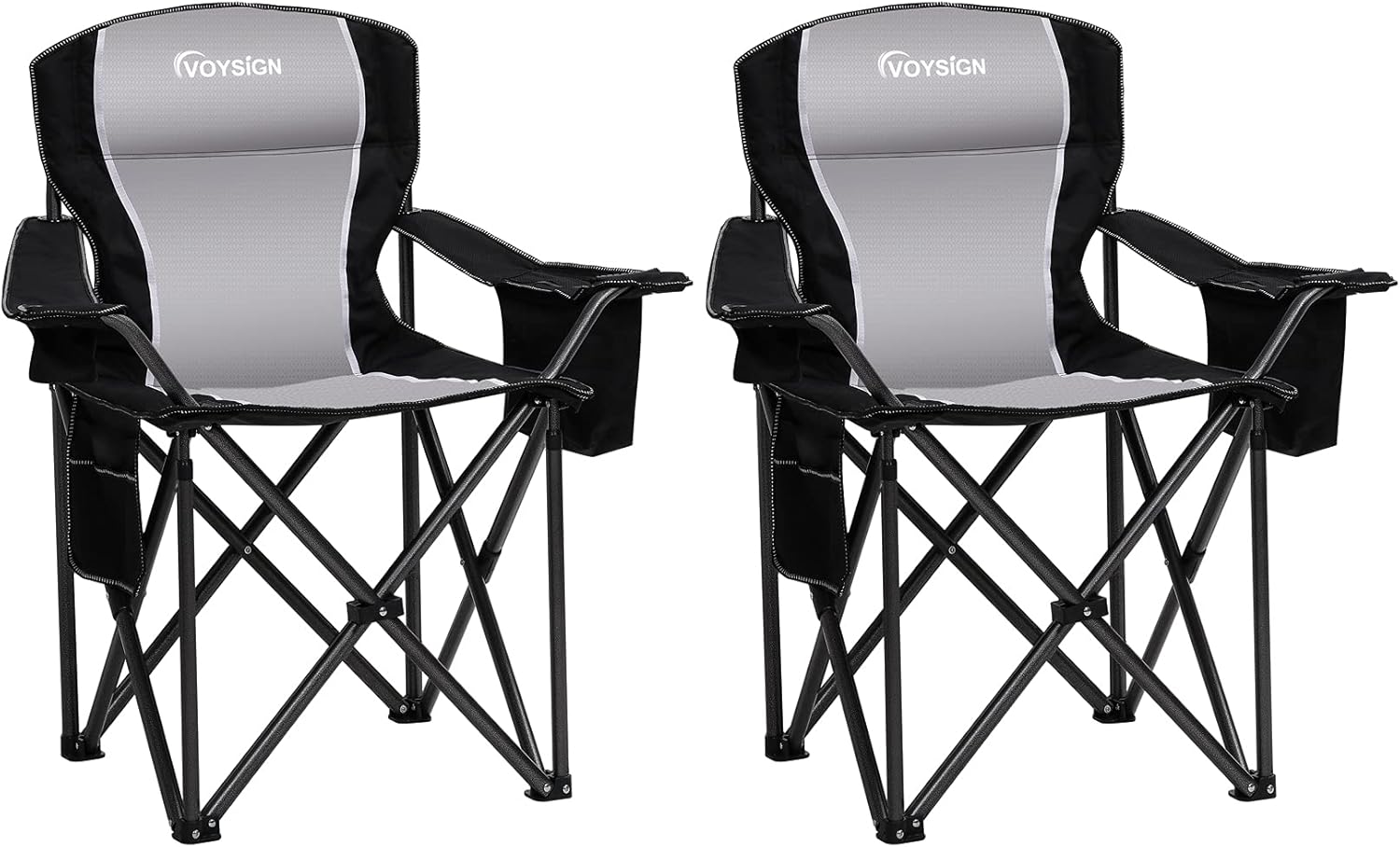 Padded Camping Chairs for Adults, Oversized Folding Outdoor Chairs, Weight Capacity 475lbs, with Cooler Bag, Cup Holder, Storage Pocket Carry Bag (Black - 2 Pack)