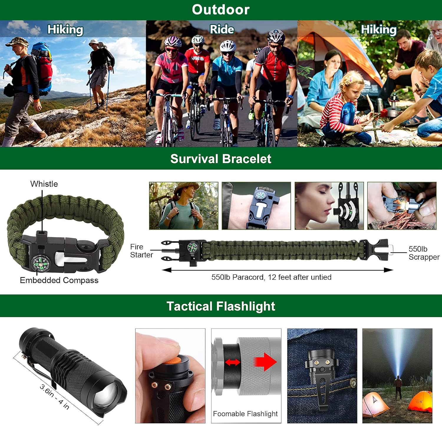 - 【Christmas gift ideas】 High-quality comprehensive emergency survival first aid equipment, best gifts for men, father, family, friends. You can enjoy a more relaxed and safe adventure with our survival kit. If you and Your family, are not satisfied with our product, please contact us in time, we will serve you wholeheartedly.