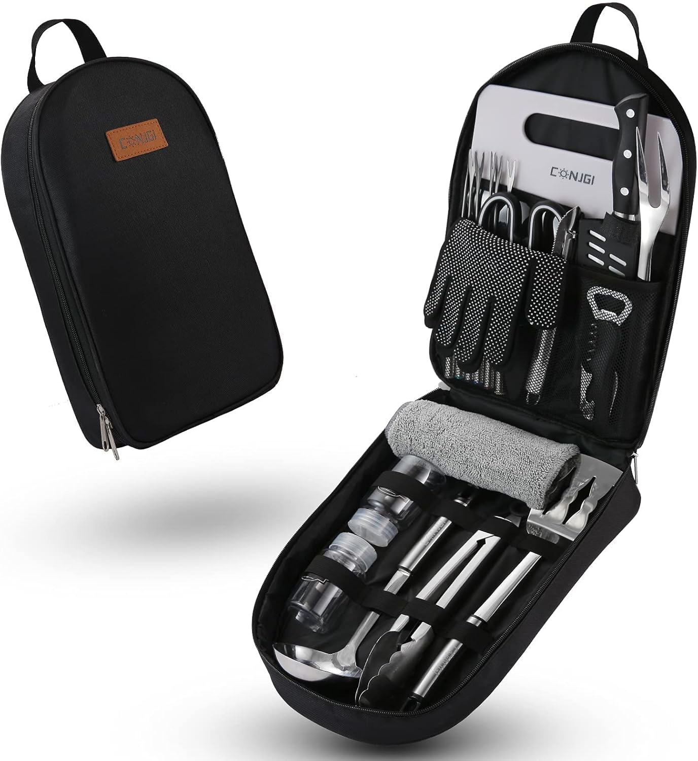 - Camping Cooking Accessories : Camping Cooking Utensils Set include Corkscrew, bread clip, scissors, chef's knife, frying spatula, barbecue clip, soup spoon, non-slip gloves, cutting board, paring knife, cleaning towel, 2* pepper shaker, 6 kebabs and storage bag,wild application beyond your imagine