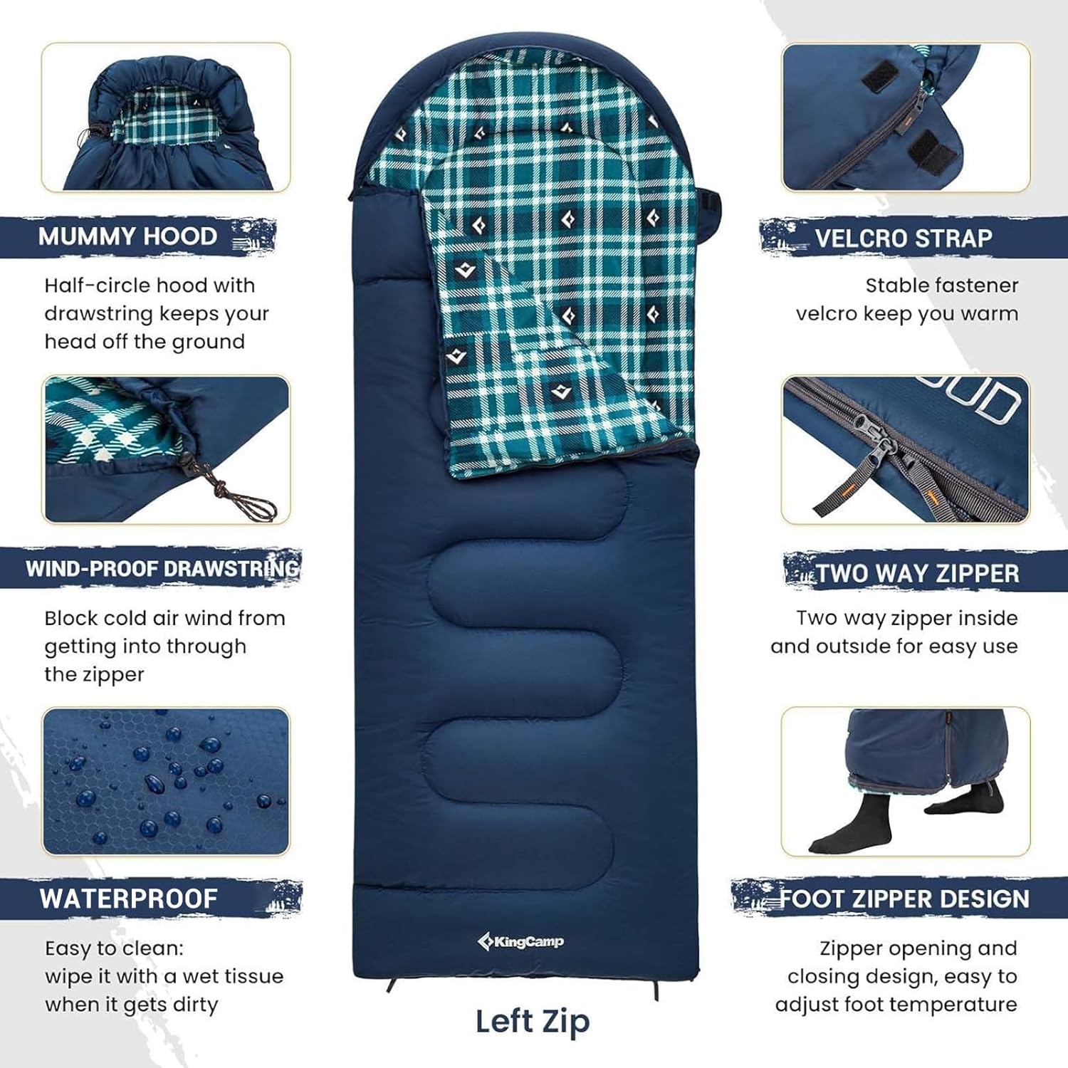 KingCamp Sleeping Bag for Adults, Cold Weather & Warm XL Big and Tall Flannel Sleeping Bags with Compression Sack Portable Waterproof Essentials Gear Accessories for Outdoor Camping