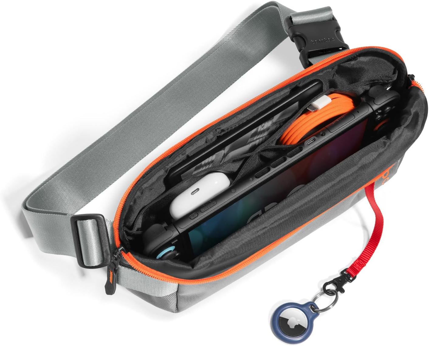 - [Multi-functional Storage] Features three compartments. Quick access front pocket for AirPods Pro, credit cards; Multiple internal pockets in the middle for tech devices, such as Nintendo Switch 2/Switch/OLED, Kindle, Power Bank, cable etc. ; Hidden back pocket for your mobile phone or passport.