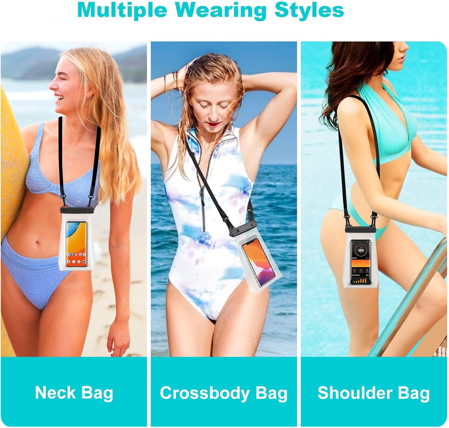 - Larger Capacity: Universal Waterproof phone bag with two pockets, one pocket can put cell phone up to 6.9'', such as iPhone 15 14 13 12 11 Pro Max X XR Xs 8 7 6 Plus; another is perfect for sunscreen, glasses, sunglasses, lipstick, paper towels, keys, watch, powers, cables, cash/credit cards, required papers for boating/fishing and so on