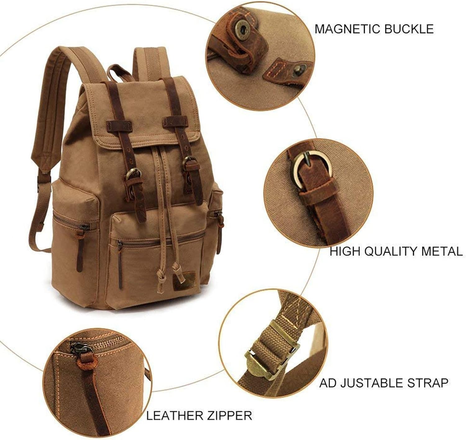 - Canvas Backpack: Made of high quality enduring canvas fabric and cowhide, our backpack has a classic but stylish design with button closure, vintage brass hardware accents, adjustable shoulder strap, easy to put on and go.