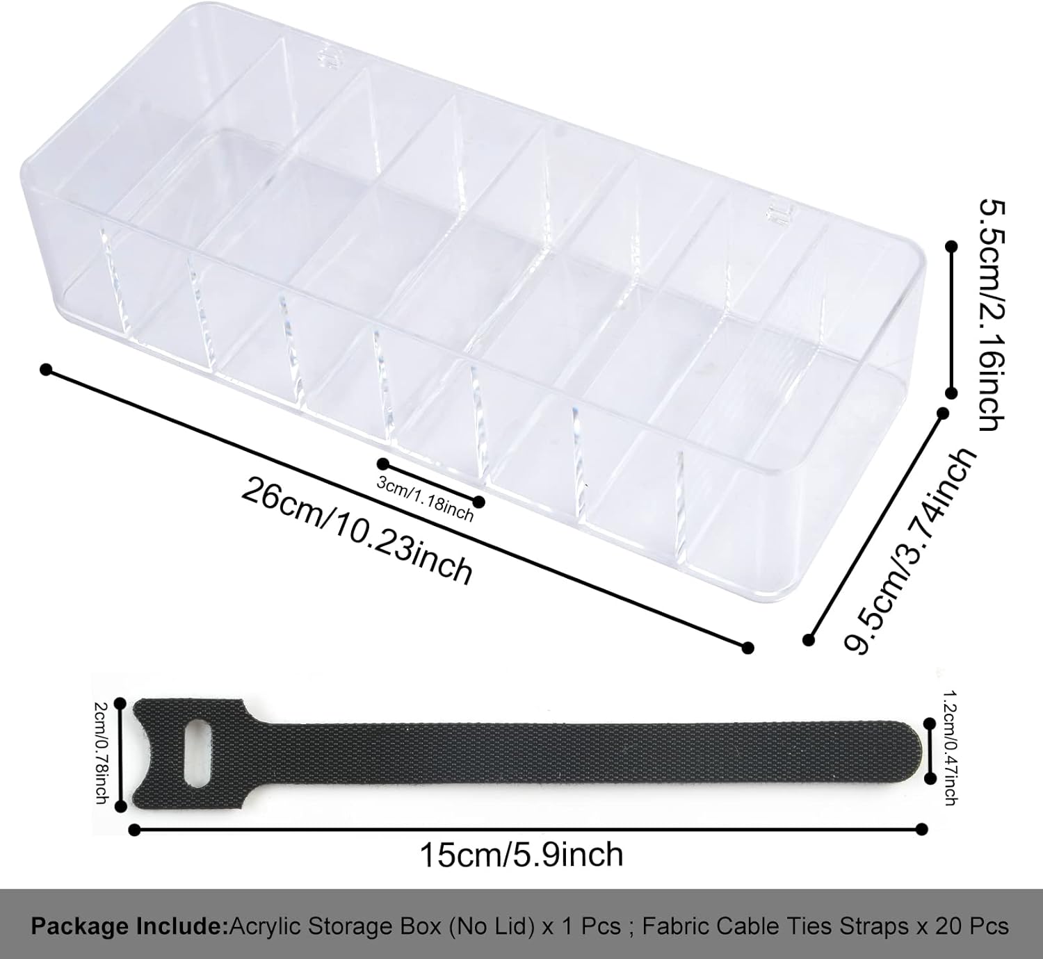 Acrylic Electronics Organizer-8 Sections Clear Cable Storage Bin Box,Cord Management Holder,Desk Storage Accessories with 20 PCS 6 Inch Reusable Fastening Fabric Cable Tie Straps Cord Wraps (No Lid)