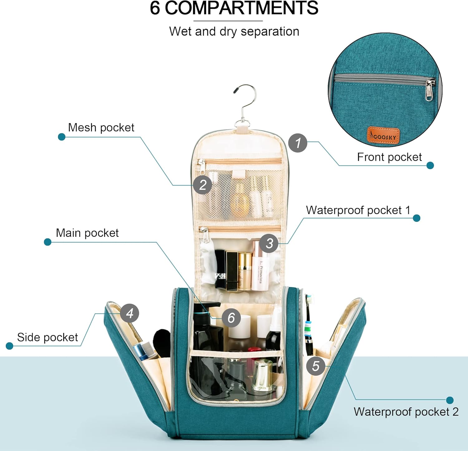 - ONSIDERABLE DESIGN - The elastic band and elastic mesh bag in the main compartment and two side compartments can keep the bottle fixed and upright. It has two waterproof compartments specially used for storing wet items. You can put your wet towel, toothbrush, shaving kit, and leaky cosmetics in it. The 360 degrees rotate metal hook gives you a variety of hanging options.