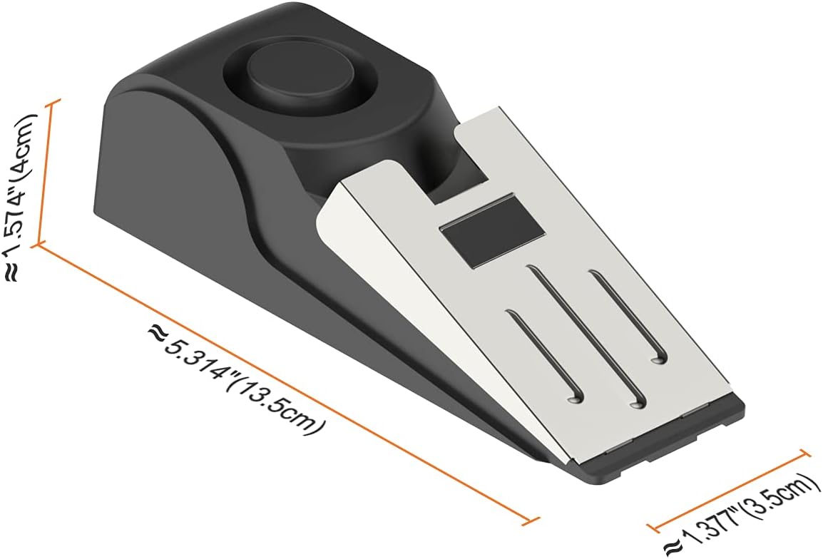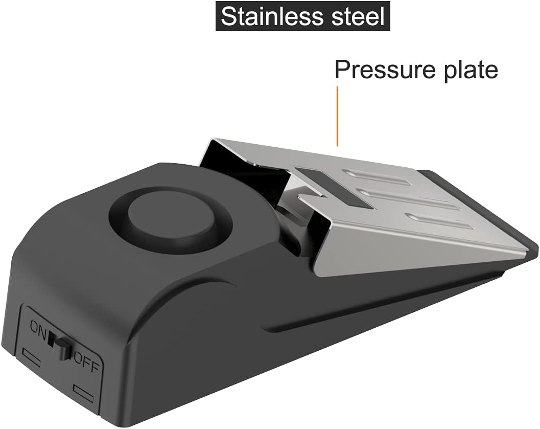 - ✔ Door Stopper Security Alarm – The door stopper alarm is in "on" status, when door pressure is applied, the door alarm will be triggered while make extremely loud 120db alarm, helps wake/alert homeowner or renter, helps deter intruder and possibly notifies neighbors, security protection.