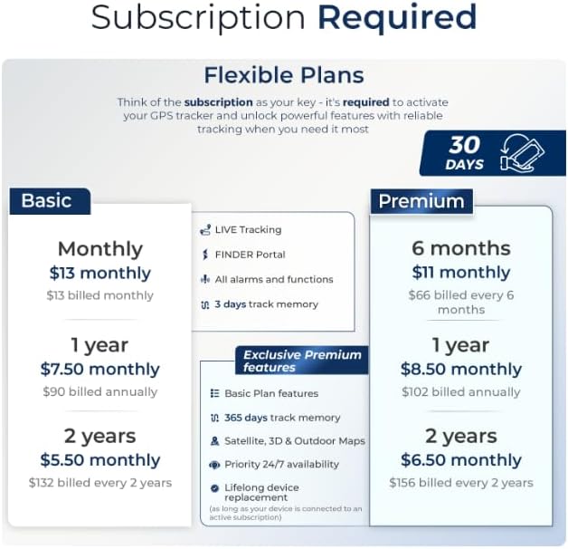 - SUBSCRIPTION: Includes a SIM card and offers a lifelong device replacement, along with 24/7 customer support in multiple languages. Control your locators with our free app compatible with Android and iOS and share it with the whole family. Choose between the Premium or Basic plans, with options from monthly to every 2 years, from $5.50 per month, with payment frequency depending on the duration of the subscription. See pricing details in images.