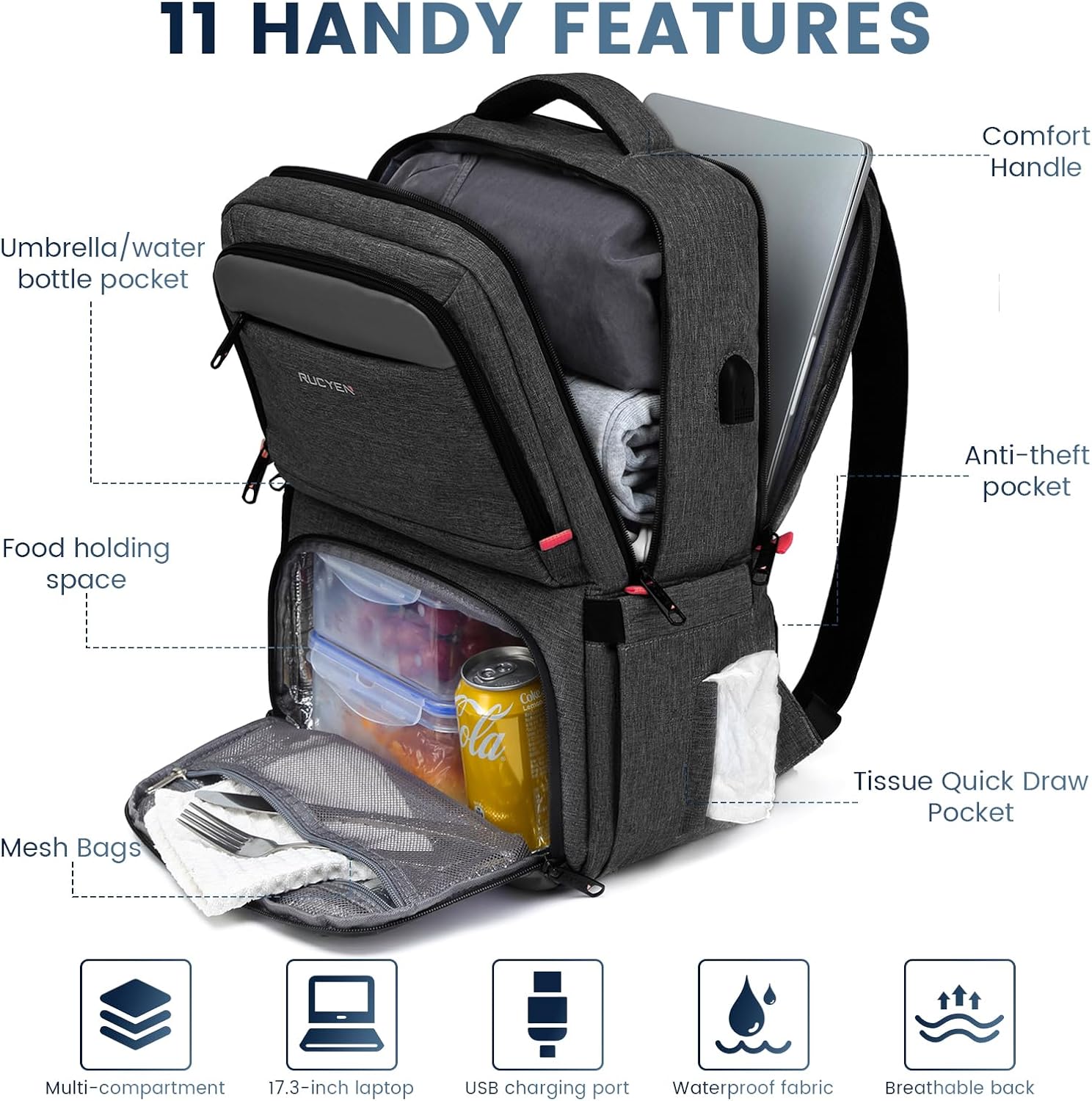 Lunch Backpack, 17.3 Inch Large Lunch Backpack Insulated Cooler Bag Travel Laptop Backpack with USB Port for Men Women, RFID Blocking for Work Picnics Black