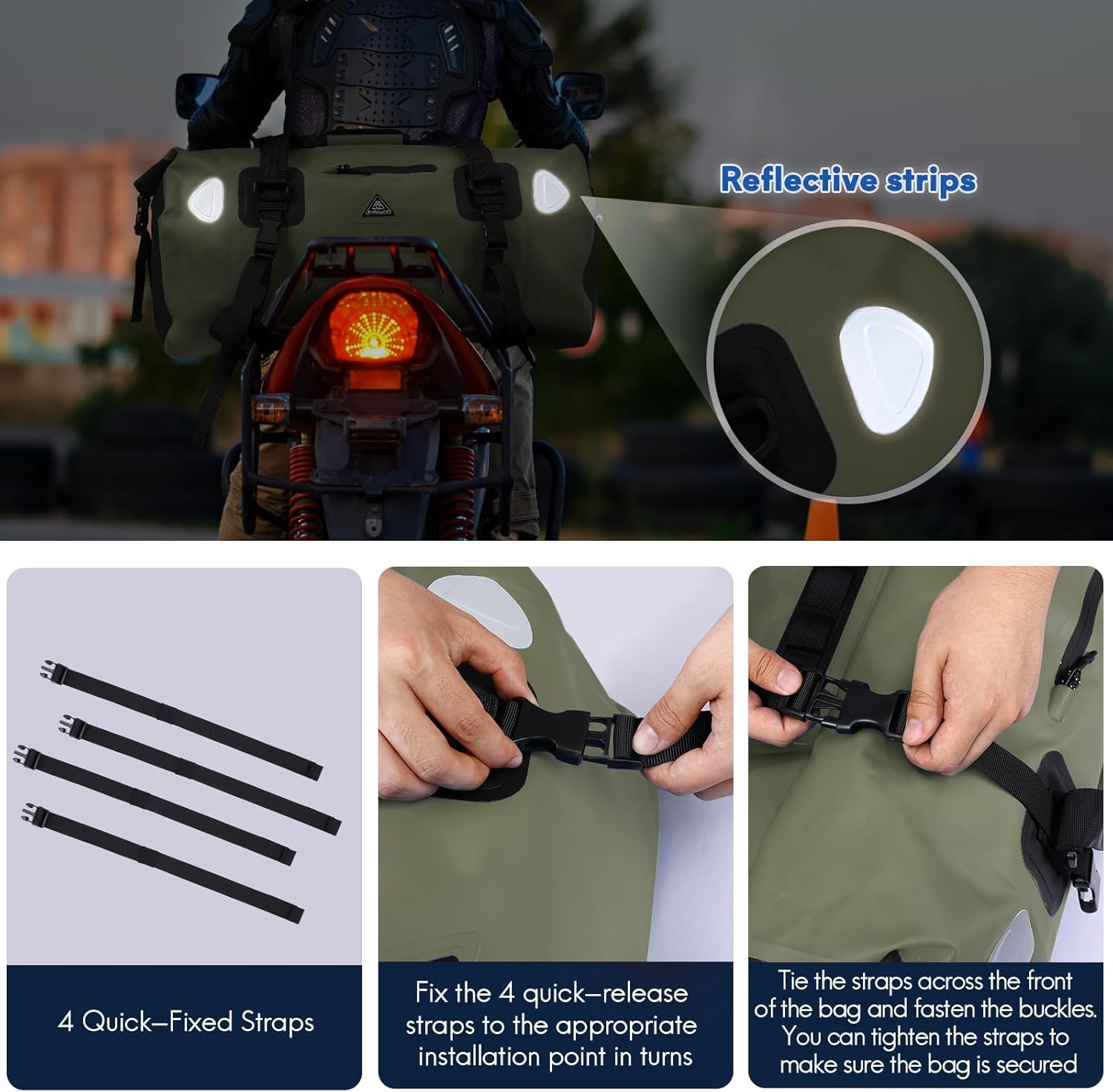 - Safety: The motorcycle duffle bag contains a total of 4 high brightness reflectors, which can provide you with good security protection for night travel. Comes with a shoulder strap and hand strap, you can carry it by hand or crossbody