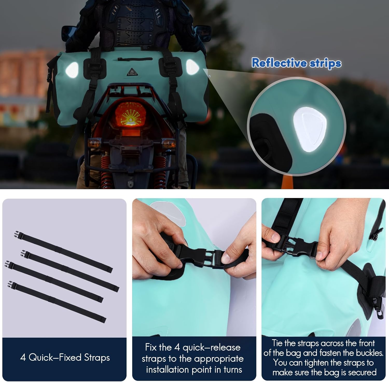 - Safety: The motorcycle duffle bag contains a total of 4 high brightness reflectors, which can provide you with good security protection for night travel. Comes with a shoulder strap and hand strap, you can carry it by hand or crossbody