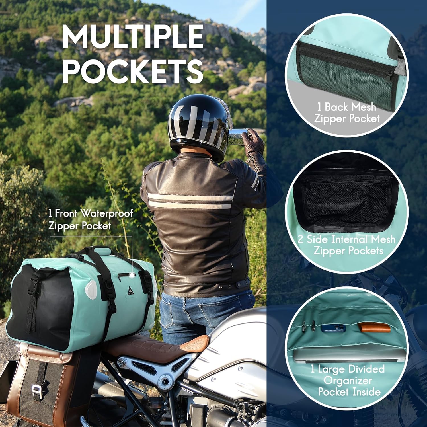 - Waterproof Duffel Bag: Haimont motorcycle dry bag is made of high grade tarpaulin which is 100% waterproof, also the most durable material, rolling up design with high frequency welded seams makes the waterproof performance more reliable