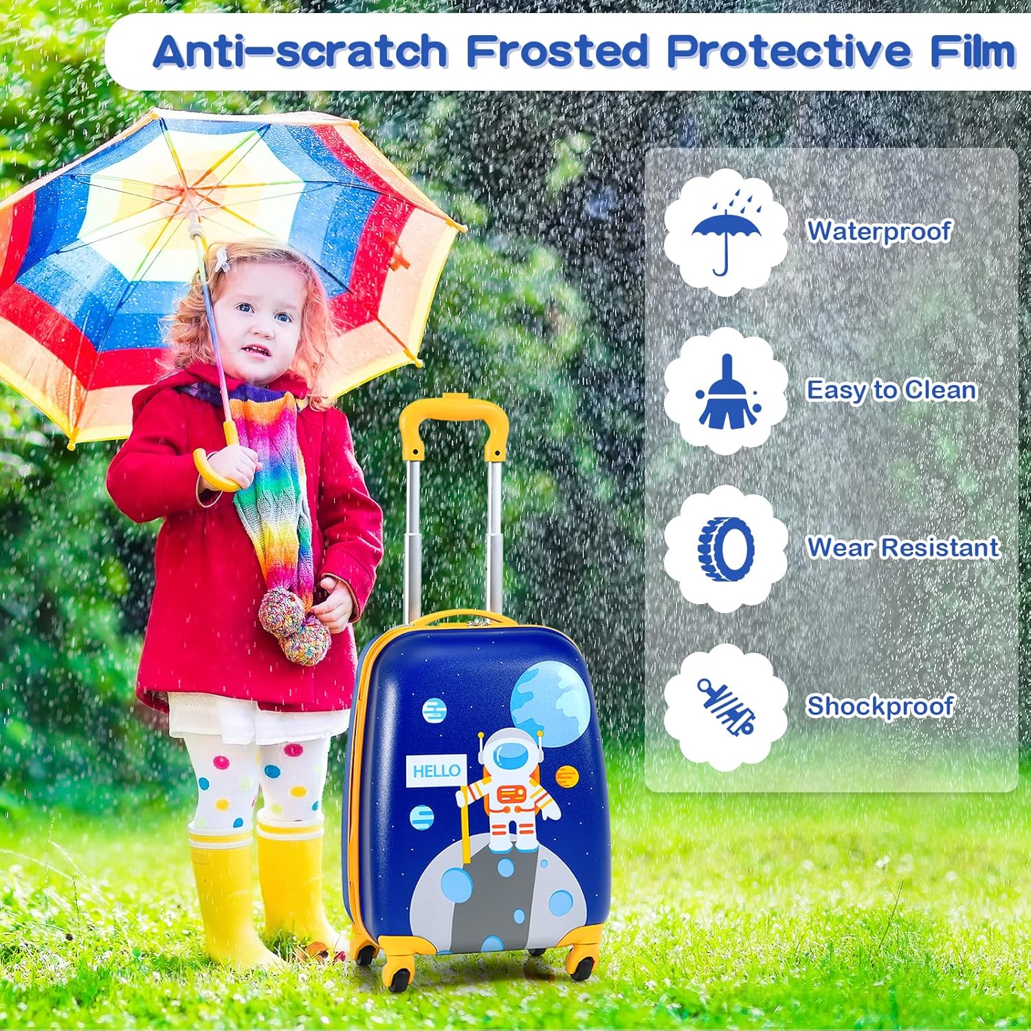 - 【Waterproof and Easy to Clean】This kids luggage set has a waterproof and scratch-resistant protective film on the surface, which is durable and can be used even in rainy weather. It’s more suggested that you can wait until it starts to peel off the layer over the graphic after 2-3 times use. If your suitcase or bag is dirty, just wipe it off with a damp cloth.