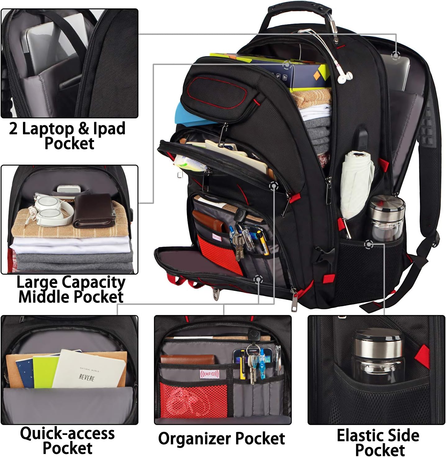 Laptop Backpack, Red, 55L Capacity, TSA Approved, RFID Anti-Theft, USB Charging Port, Headphone Hole, Back Luggage Strap, Chest Strap, Laptop Backpack