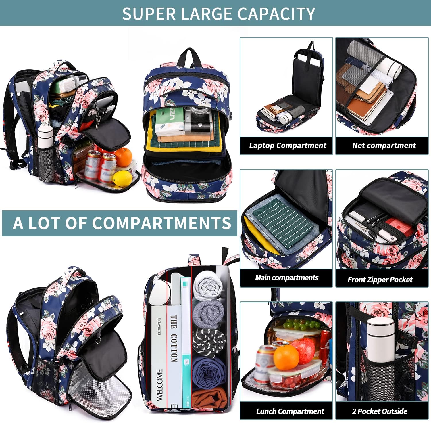 - TONS OF STORAGE & POCKETS- lunch backpack for Women own 1 separate thicker padded laptop compartment to hold up 17.3 inch laptop. 3 main compartments with double zippers can accommodate 50 liters of things, such as lunch, clothes, travel accessories and other daily necessities. Both side water bottle pockets outside for holding water bottles or umbrellas. More than 15 functional pockets ensure you to keep your personal belongings well-organized and get them easily.