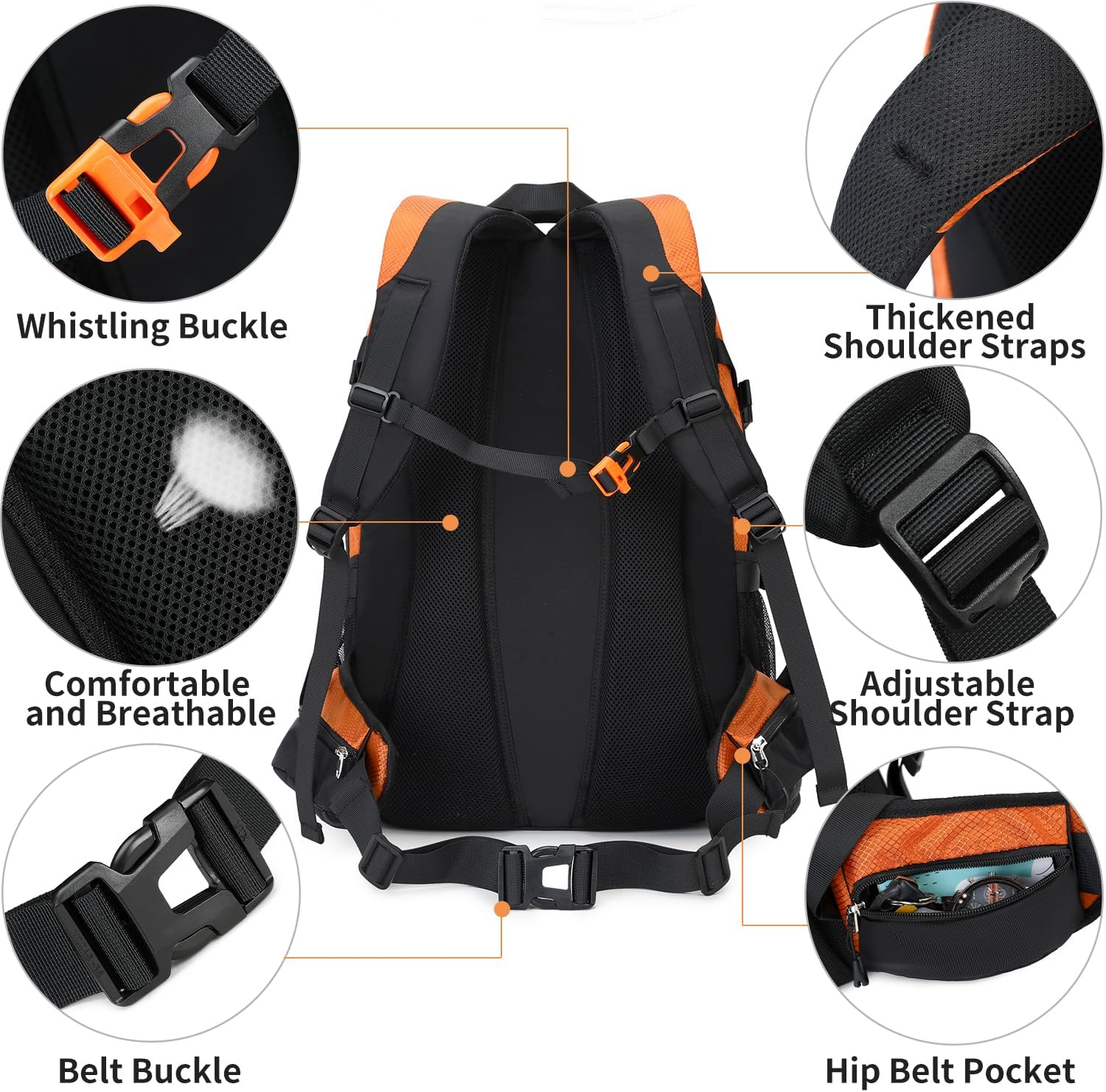- 【Ergonomic and Comfortable Design】For passionate hikers or trekkers, this travel backpack equips with the breathable mesh padding, with ergonomic design breathable system and lightweight design help to reduce fatigue during a long day of hiking, which is the perfect hiking daypack for outdoor sports. This waterproof backpack provides body comfort even when hiking backpack is completely full. And chest buckle designed as a survival whistle for quick and easy use in case of emergency.