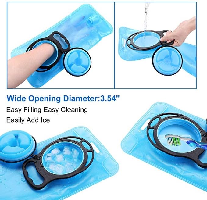 - LARGE OPEN FOR EASY FILLING & CLEANING: The 2L hydration bladder opening design is so large that you can fill / refill water easily even you are not taking it out of hydration backpack. Also can put some big ice cubes into water bladder to keep water cool. Large opening help you reach every corner inside, and give your water reservoir bladder thorough cleaning.