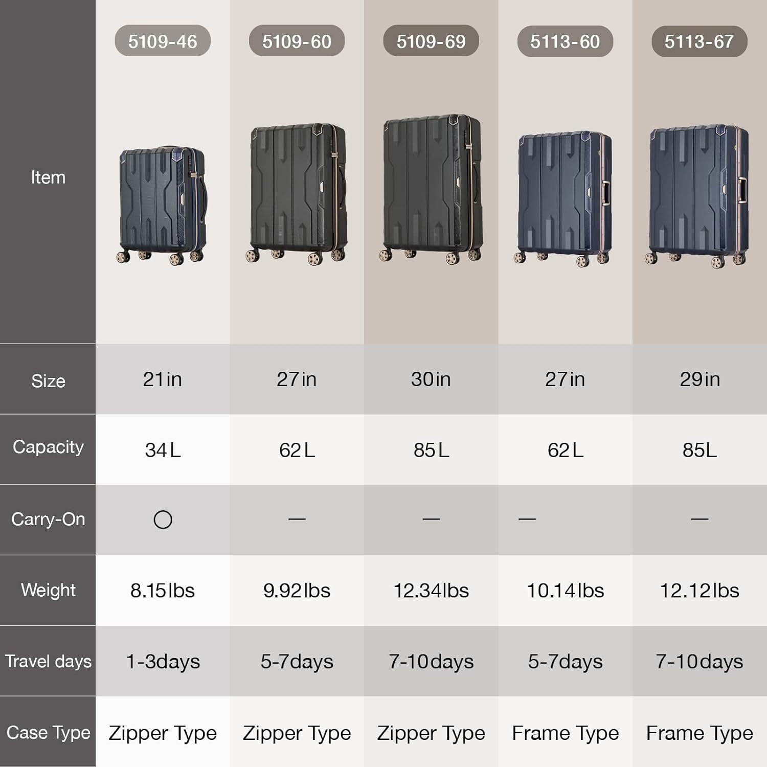 - Sizing; 27-in.Check-in,Overall : 26.77"H×17.72"W×11.02"(+1.97") D, Body: 23.62" H x 16.14" W x11.02"(+1.97") D, 8.60 lbs, 62(73) L