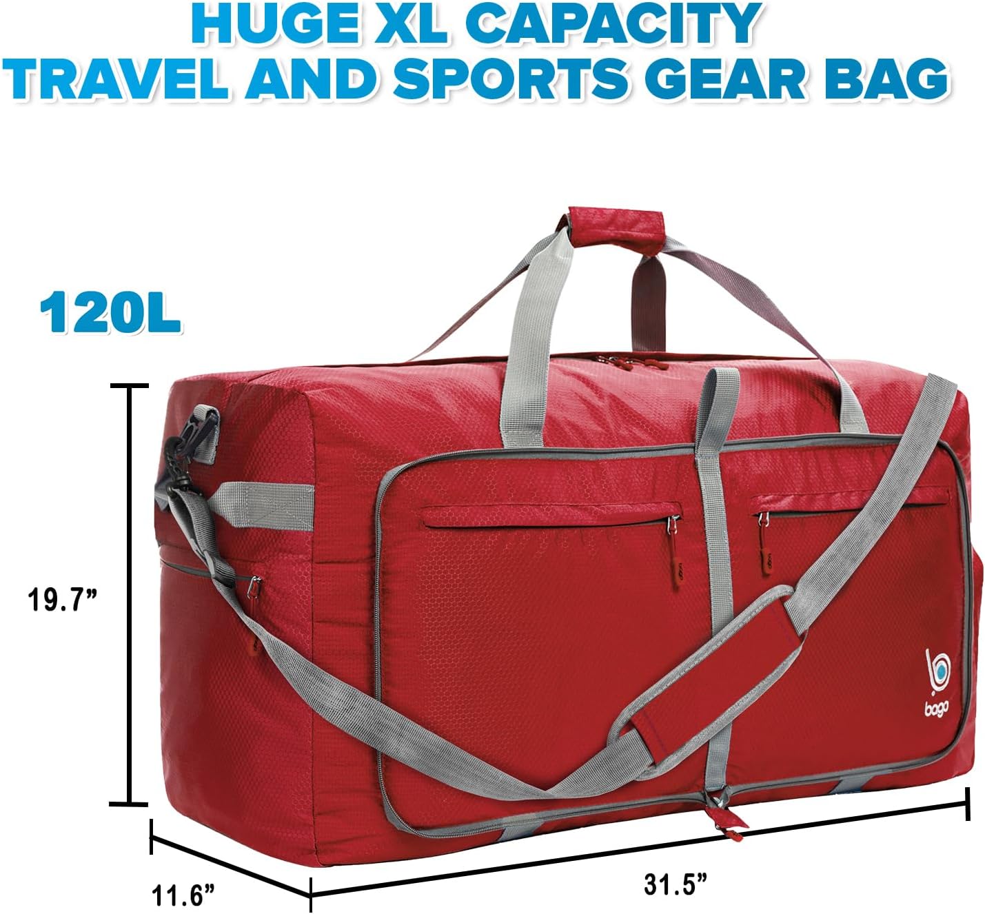 Bago Large Foldable Duffel Bags for Traveling Women & Men - 120L Packable Duffle Bag for Travel with Shoe Compartment - Water Repellant, Heavy Duty, Lightweight Folding & Collapsible (Red)