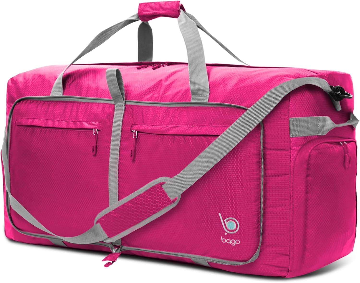 Bago Large Foldable Duffel Bags for Traveling Women & Men - 120L Packable Duffle Bag for Travel with Shoe Compartment - Water Repellant, Heavy Duty, Lightweight Folding & Collapsible (Pink)