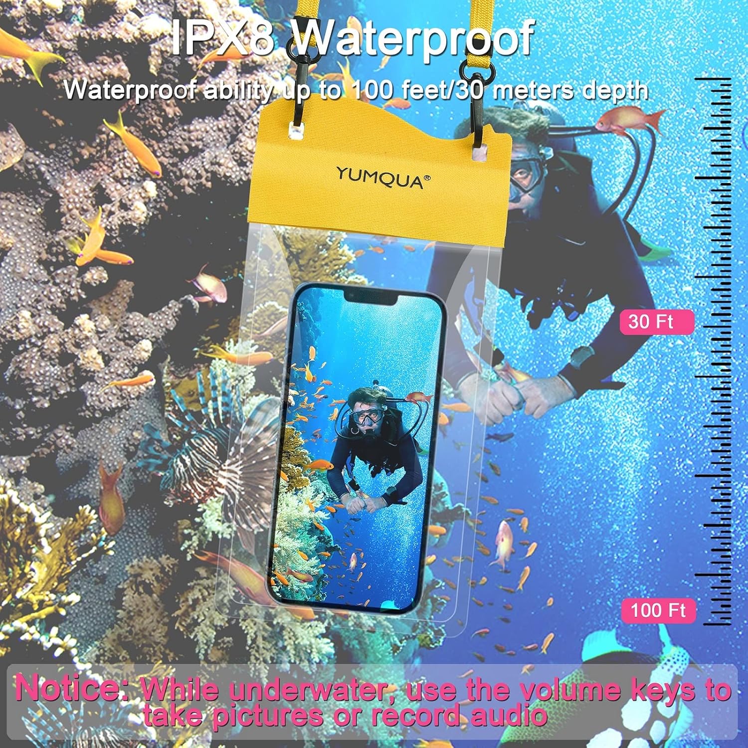 - 【Tips】1. Please make sure this waterproof cell phone pouch is sealed before using it underwater. 2. Not applicable to Touch ID. 3. The phone may be subjected to water pressure under a certain depth, which affects the operation of the touch screen. In this case, press the volume key to take a photo or record.