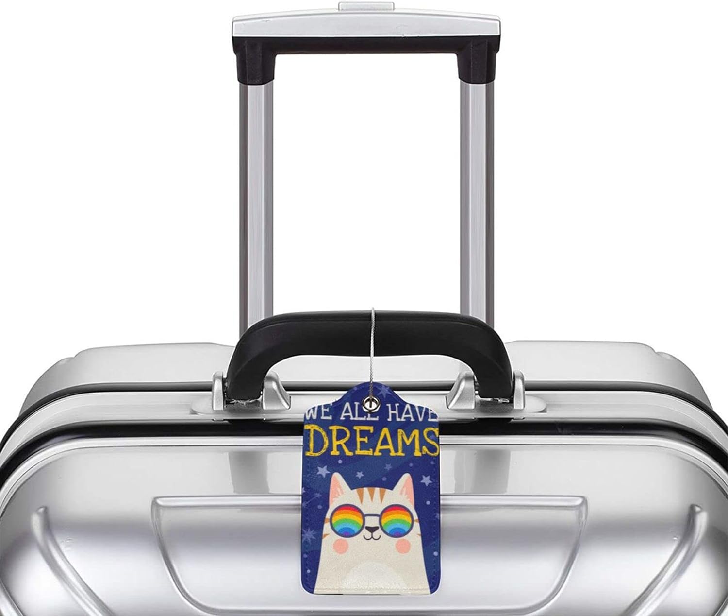 2 Cute Cat with Rainbow in Eye Glasses Luggage Tags, We All Have Dreams Encouraging Letters Suitcase Tag Privacy Name ID Card Travel Bag Labels for Friends Adults Kids
