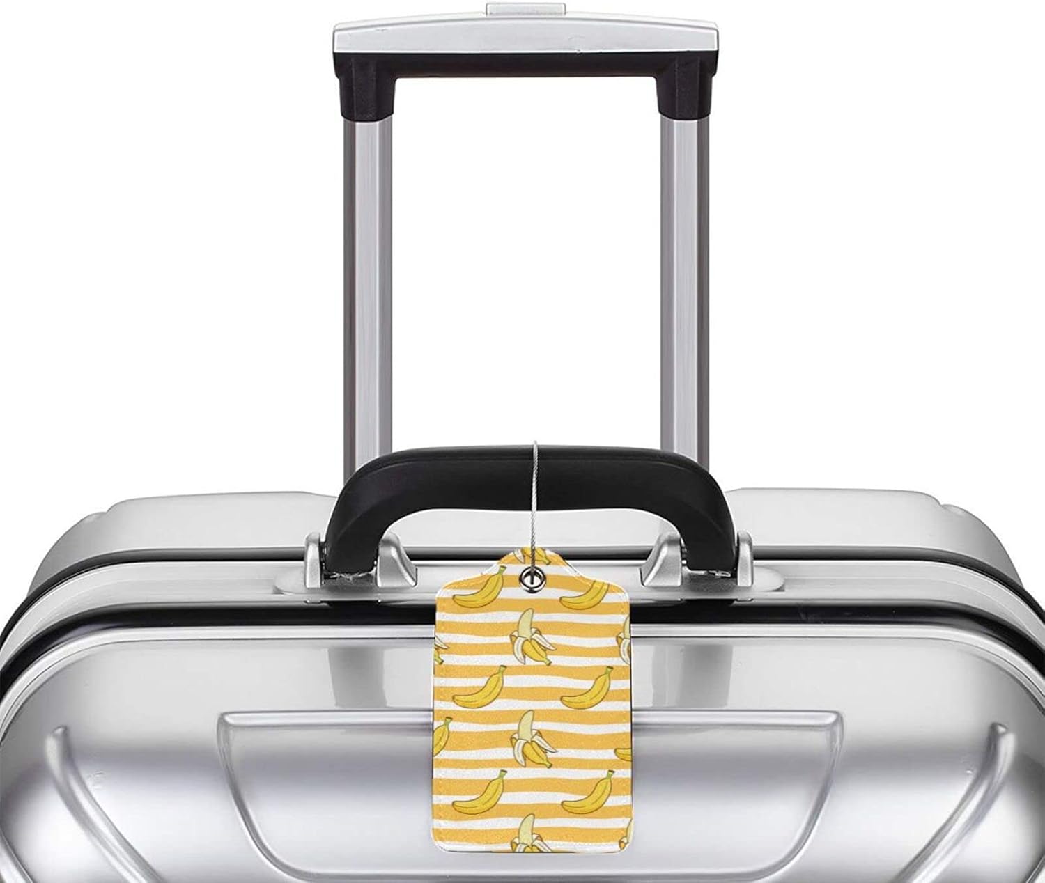 2 Packs Bananas Crew Luggage Tag for Adult Kids, Cute Yellow Background Fruit Suitcase Tag Labels Leather Travel Baggage Identifiers Tags with Full Back Privacy Name ID Card