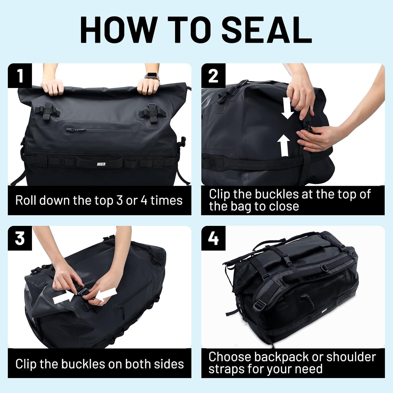 - 100% Waterproof & Sandproof --- MIER dry duffle backpack is made of abrasion-resistant, water-repellent tarpaulin and has fully welded seams for absolute protection. Its wide hook-and-loop-secured roll-top opening enables quick access. To seal: simply fold the top down 3 times and secure with side clips for a snug, compressed, weatherproof fit