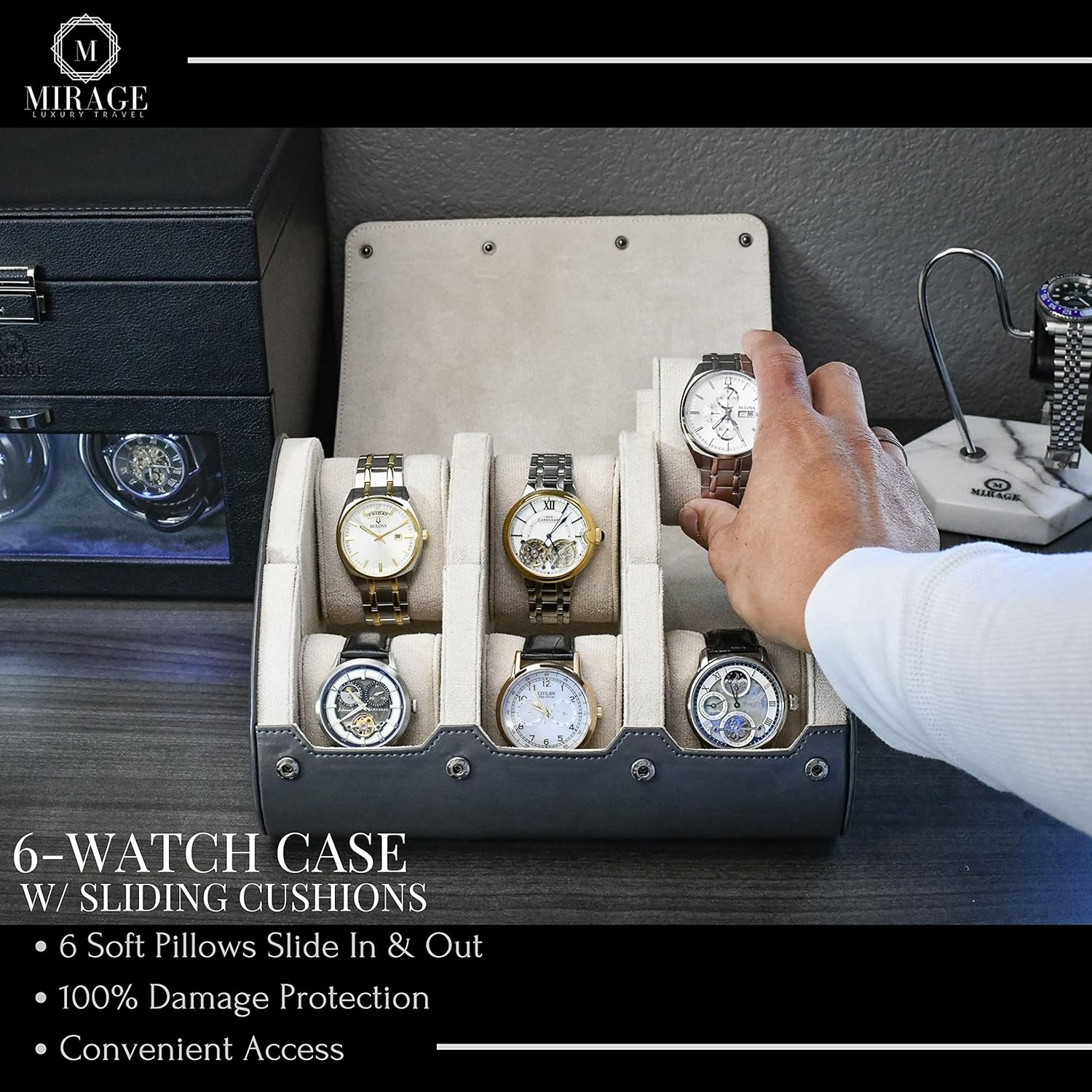- ⌚ INNOVATIVE FLAT BASE CONCEPT – This 6 watch display case has unquestionable stability. It has a flat base concept that doesn’t roll around like other watch rolls do. Perfect for safe placement on your desk and lets you show off your collection at home or at work.