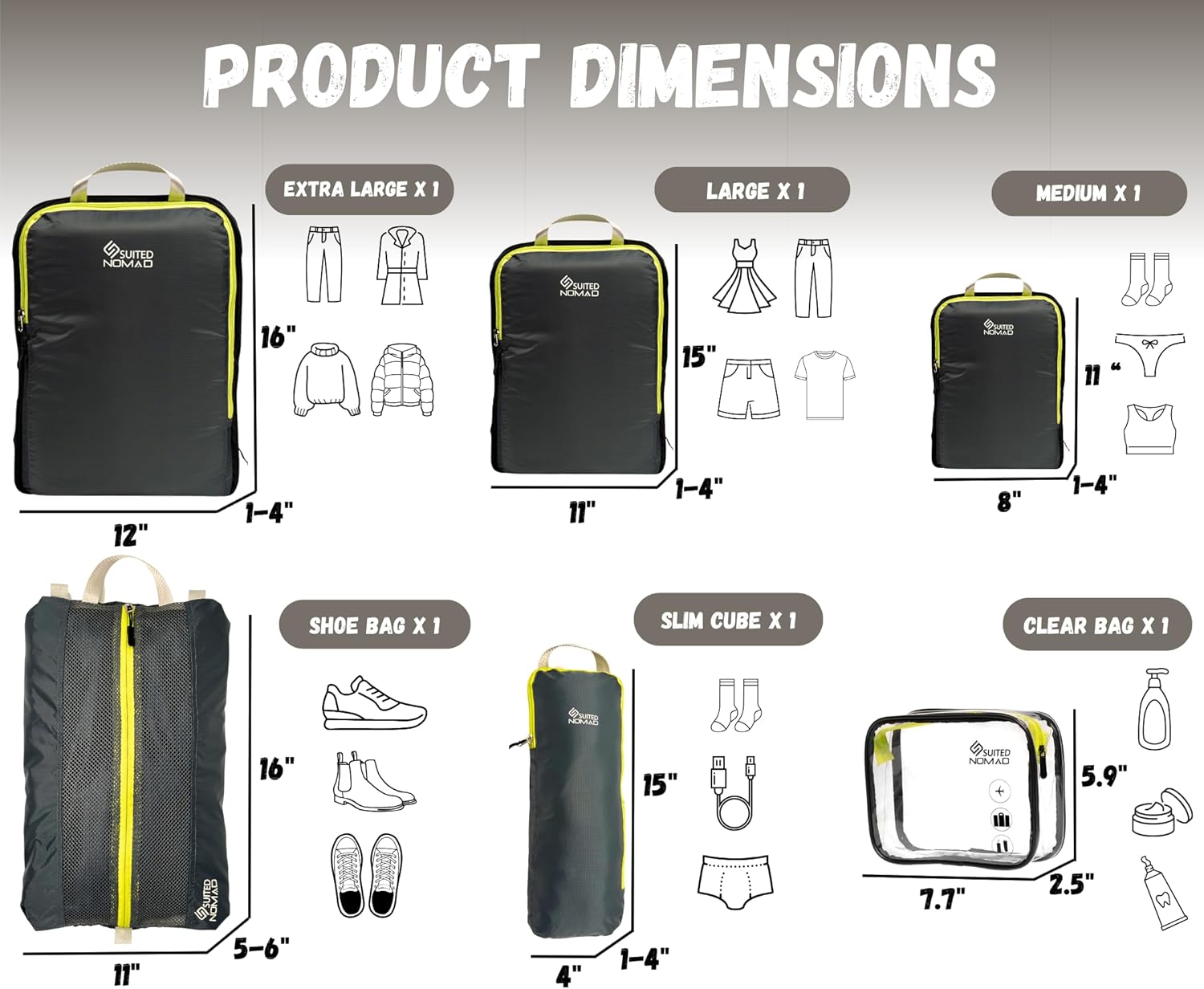 - Essential accessory for any men and women - Compression Packing Cubes Set includes: 1 Extra Large Cube: 16x12x1 in; 1 Large Cube: 15x11x1 in; 1 Medium Cube: 11x8x1 in; 1 Slim Cube: 15x10x2 in; 1 Travel Shoe Bag: 16x11 in; 1 Clear Toiletry Bag: 7.7x5.9x2.5 in