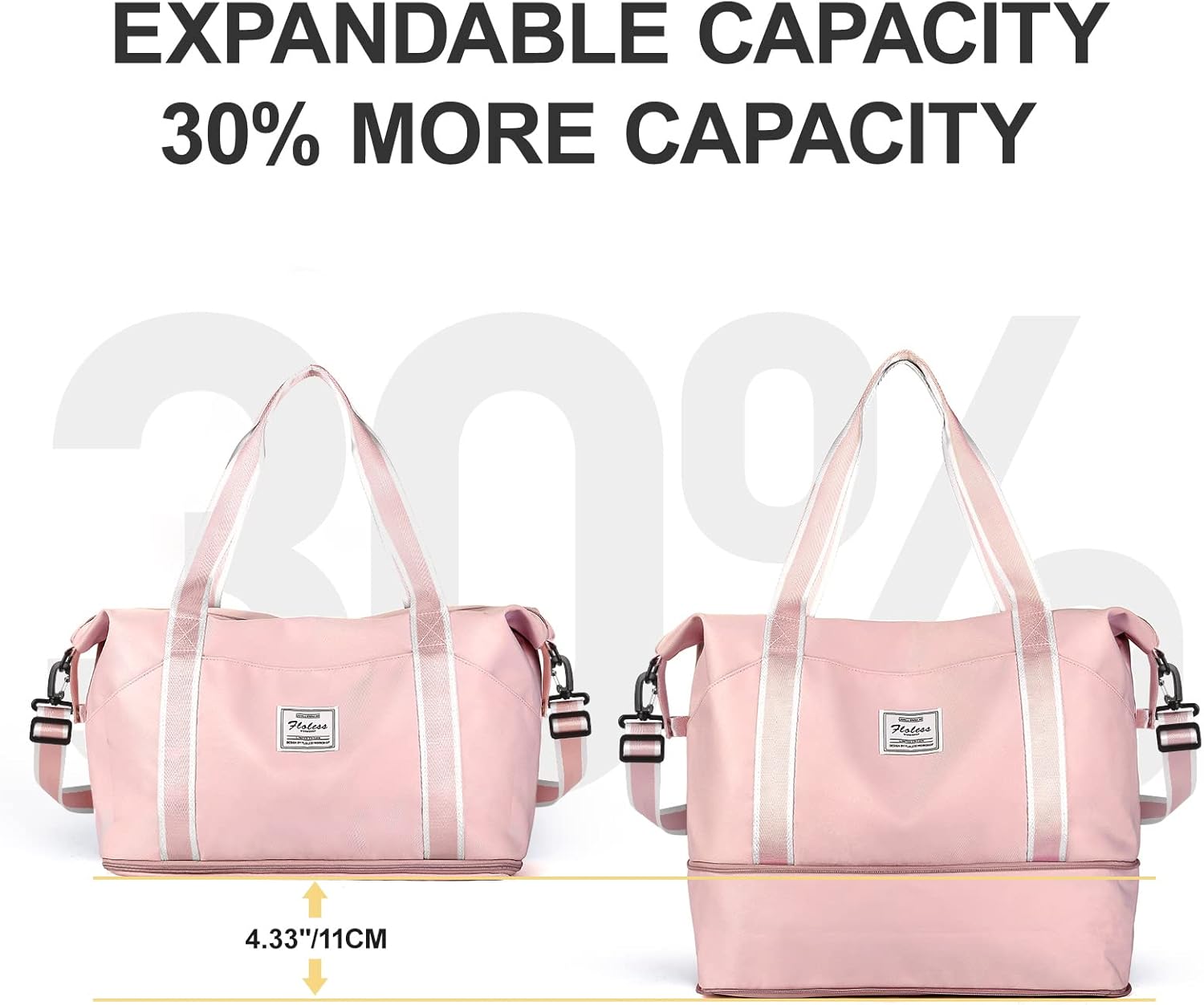 - 【High Capacity Travel Bag】Travel Bag has three multiple internal and four external organizational pockets,which ensure you placed more scientifically and orderly.The overnight bag for women has Large Capacity.Ordinary size :41*26*22CM,Expansion Dimension:41*37*22CM.You can carry it onto an airplane. Large storage space for a clothes for short trip.It has a capacity of 35L and can hold 6 to 8 pieces of summer clothes,Cosmetics,toiletries,wallets,keys,earphones,mobile power,mobile phones,files.