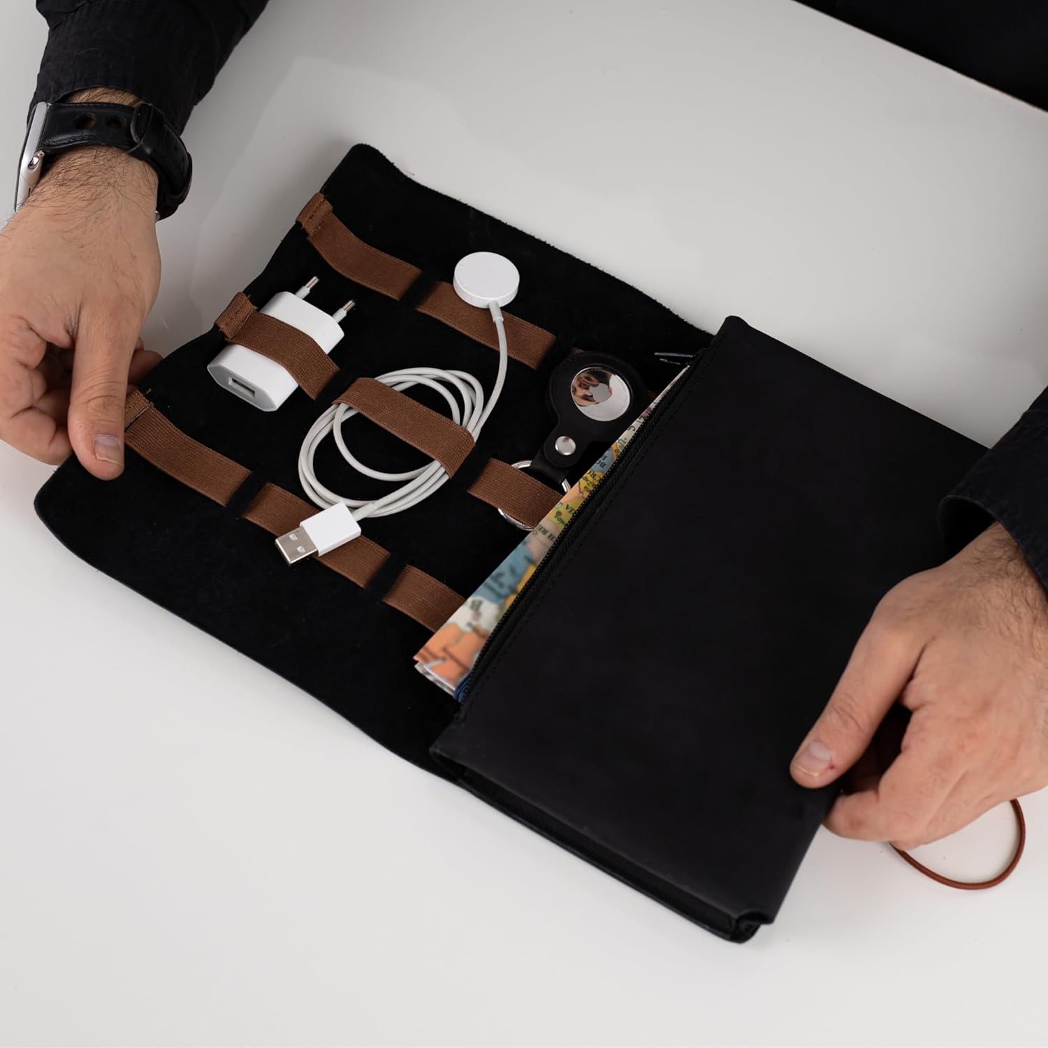 HARDISTON Custom Genuine Leather Electronic Cable Organizer Bag Handmade Travel Cord Organizer Roll Case for Hard Drives, Cables, Charger, Phone, USB, SD Card (Large - Black)