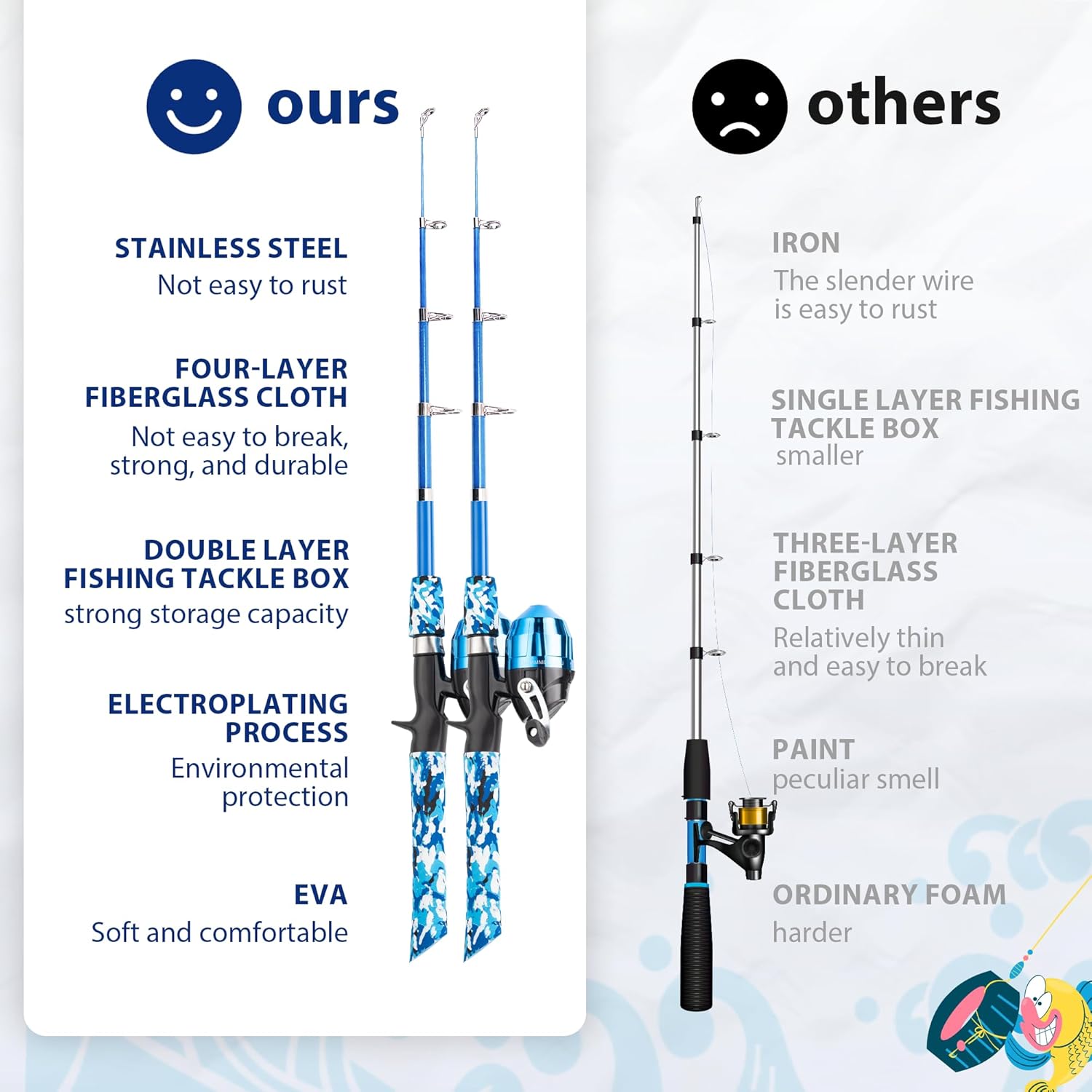 - Specially designed for children: Our kids fishing rods are suitable for children over 4 years old. The 4-eye (1.5M 5Ft) retractable design and non-slip handle are all conducive to children's holding and use. The four-layer fiberglass cloth makes the fishing rod have better toughness and is not easy to break and rust, and it is also beneficial to the safety of children. At the same time, the design of the two-piece fishing rods can also allow two children to spend a happy fishing time together