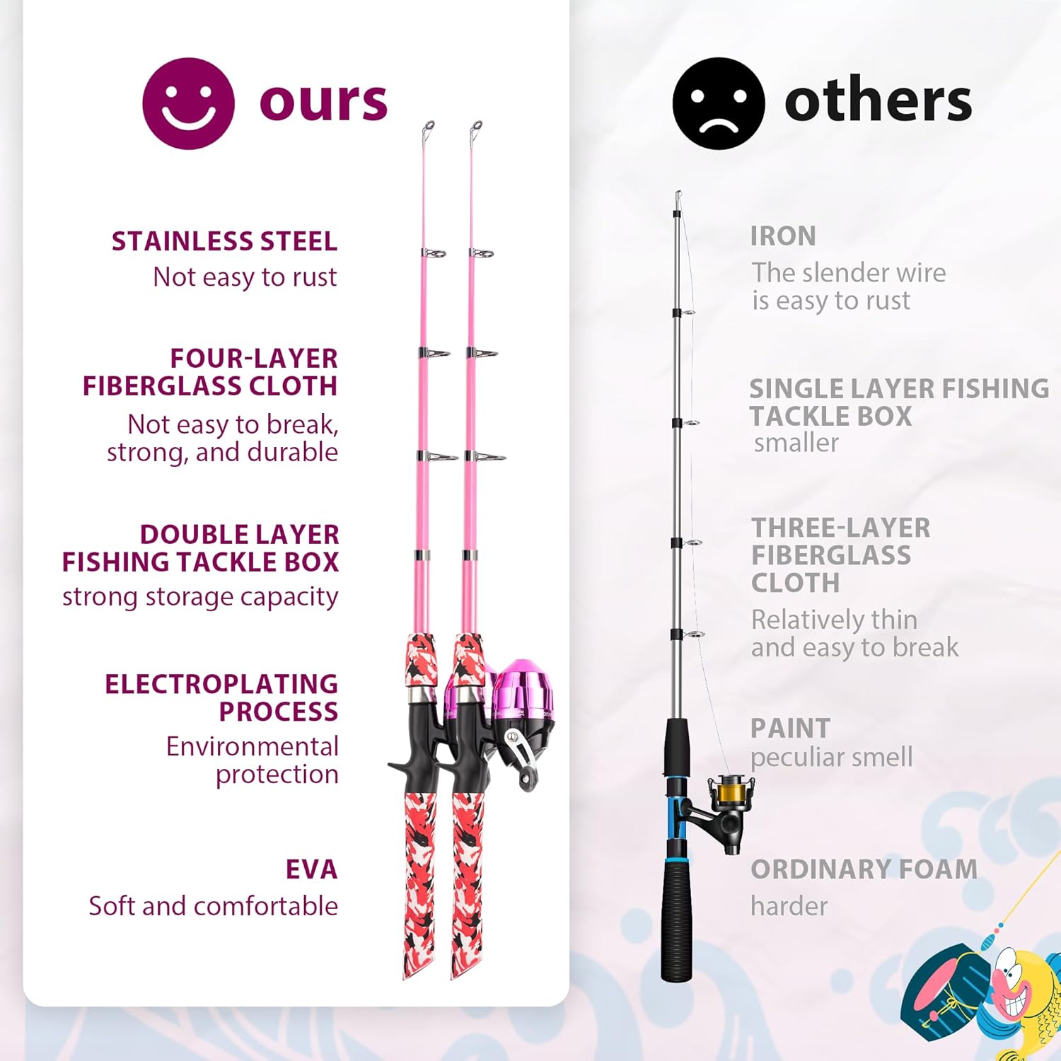 - Specially designed for children: Our kids fishing poles are suitable for children over 4 years old. The 4-eye (1.5M 5Ft) retractable design and non-slip handle are all conducive to children's holding and use. The four-layer fiberglass cloth makes the fishing rod have better toughness and is not easy to break and rust, and it is also beneficial to the safety of children. At the same time, the design of the two-piece fishing rods can also allow two children to spend a happy fishing time together