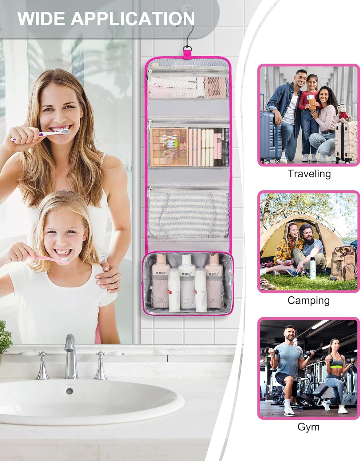 Relavel HangingTravel Toiletry Bag for Women, Large Capacity Toiletries Bag, Travel Essentials Organizer, Hanging Makeup Case for Accessories, Waterproof Bathroom Shower Bag (hot pink)